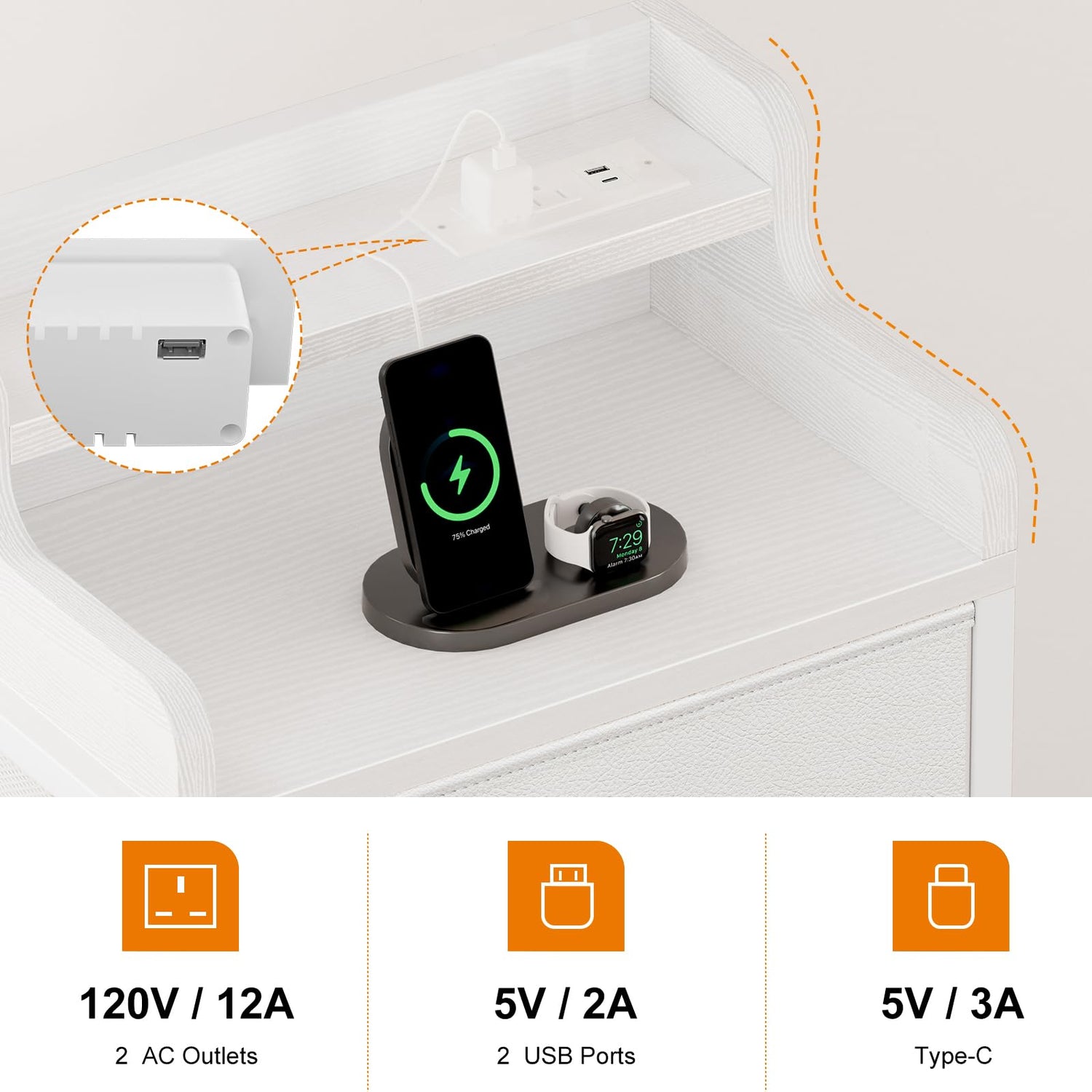 • Night Stand with Upgrade Charging Station: Charging station is equipped with two standard plug sockets, two USB ports and a 4.9 foot power cord. Upgrade: The light strip no longer occupies the socket hole, there are separate USB ports below! Very convenient