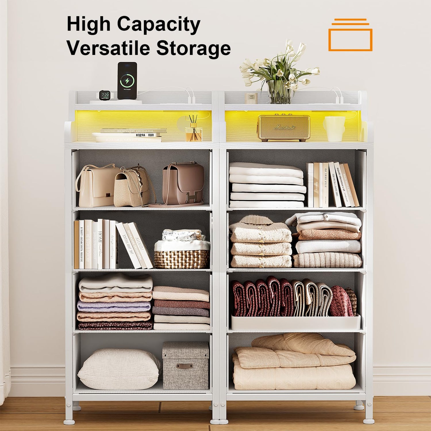 REAHOME Nightstand with Charging Station and LED Light, Tall White Night Stand with 4 Drawers and 2-Tier Shelf, Bedside Table with Sturdy Steel Frame Wood Top for Bedroom, Living Room - White