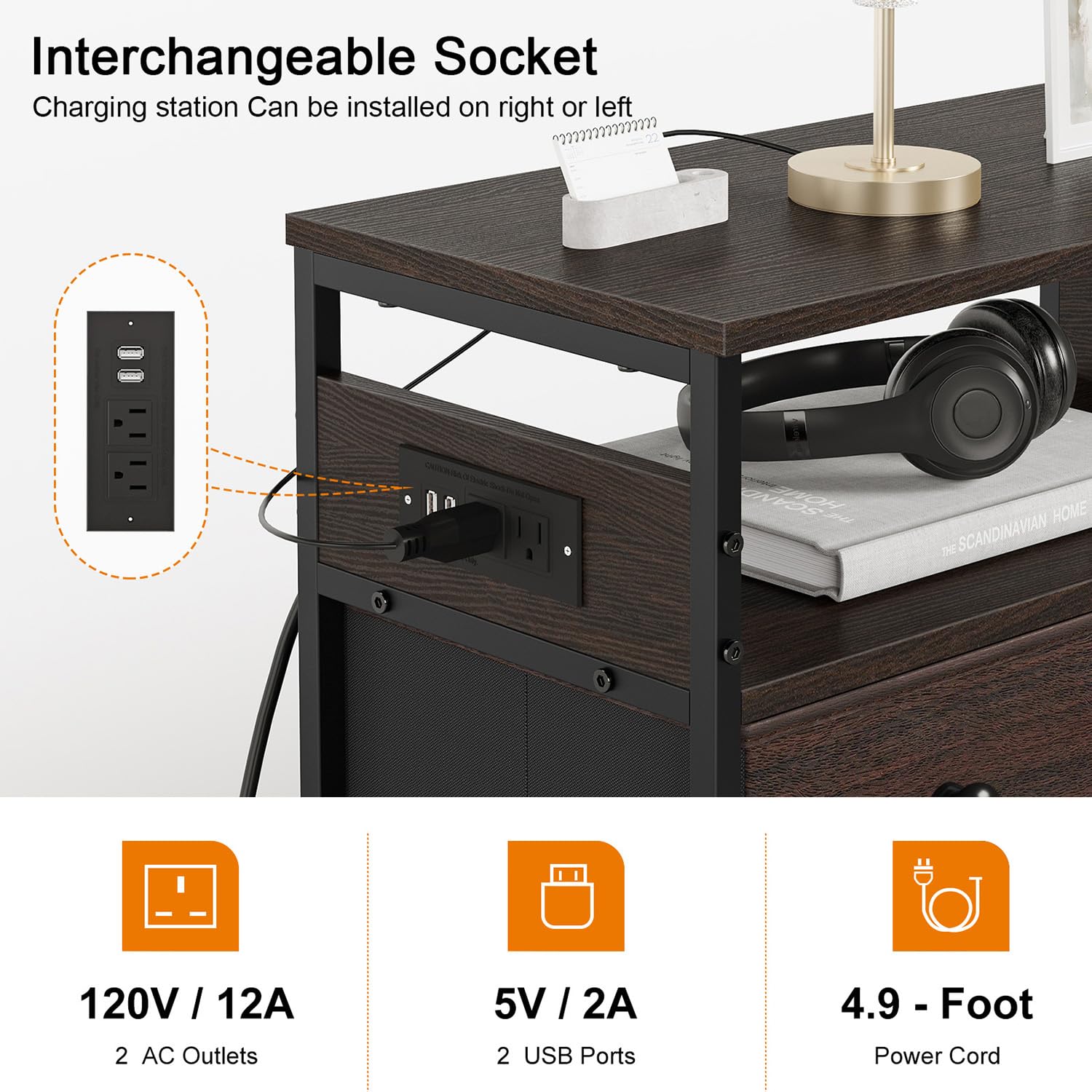- ✩[Night Stand with Charging Station] The charging station is equipped with two standard plug sockets, two USB ports and a 4.9 foot power cord. It can charge multiple devices such as mobile phones, headphones, watches, computers, etc. at the same time. You can also install the left and right positions of the charging station according to your usage habits!