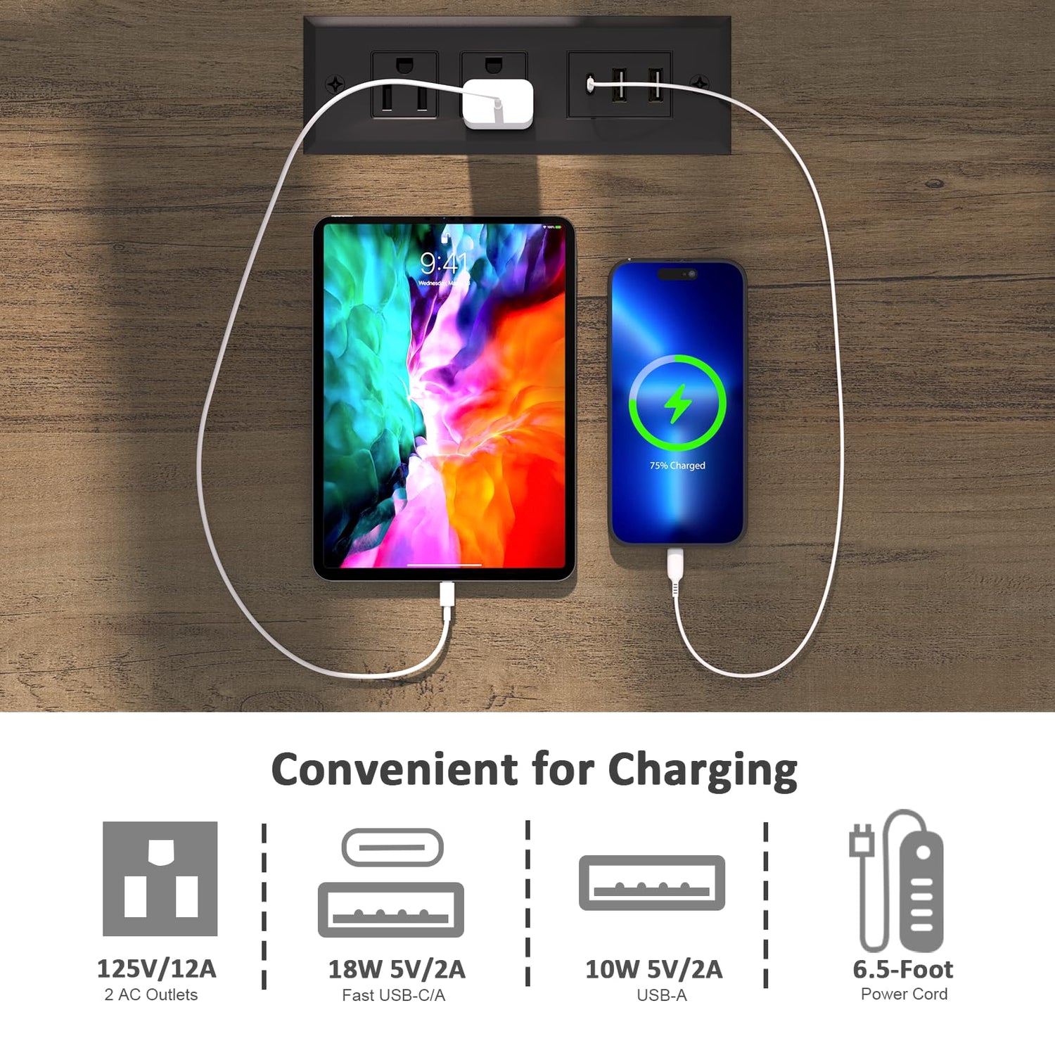 - 【Charging with Fast-Charge USB Ports】 The end table with charging outlets and fast-charge USB ports is arranged with 2 standard AC power outlets and 3 USB ports. USB-C&USB-A ports: 18W. The nightstand with charging station provides convenience for charging cell phones, tablets, headphones, desk lamps and other devices.