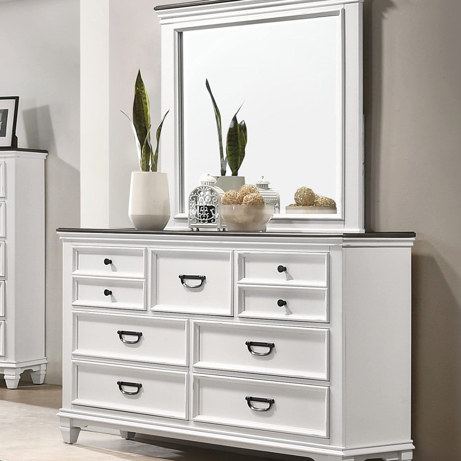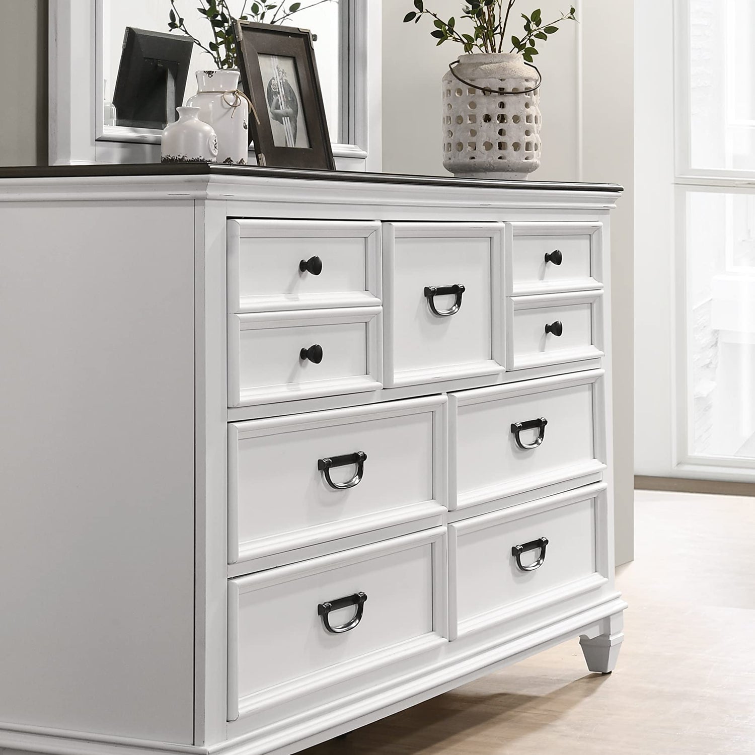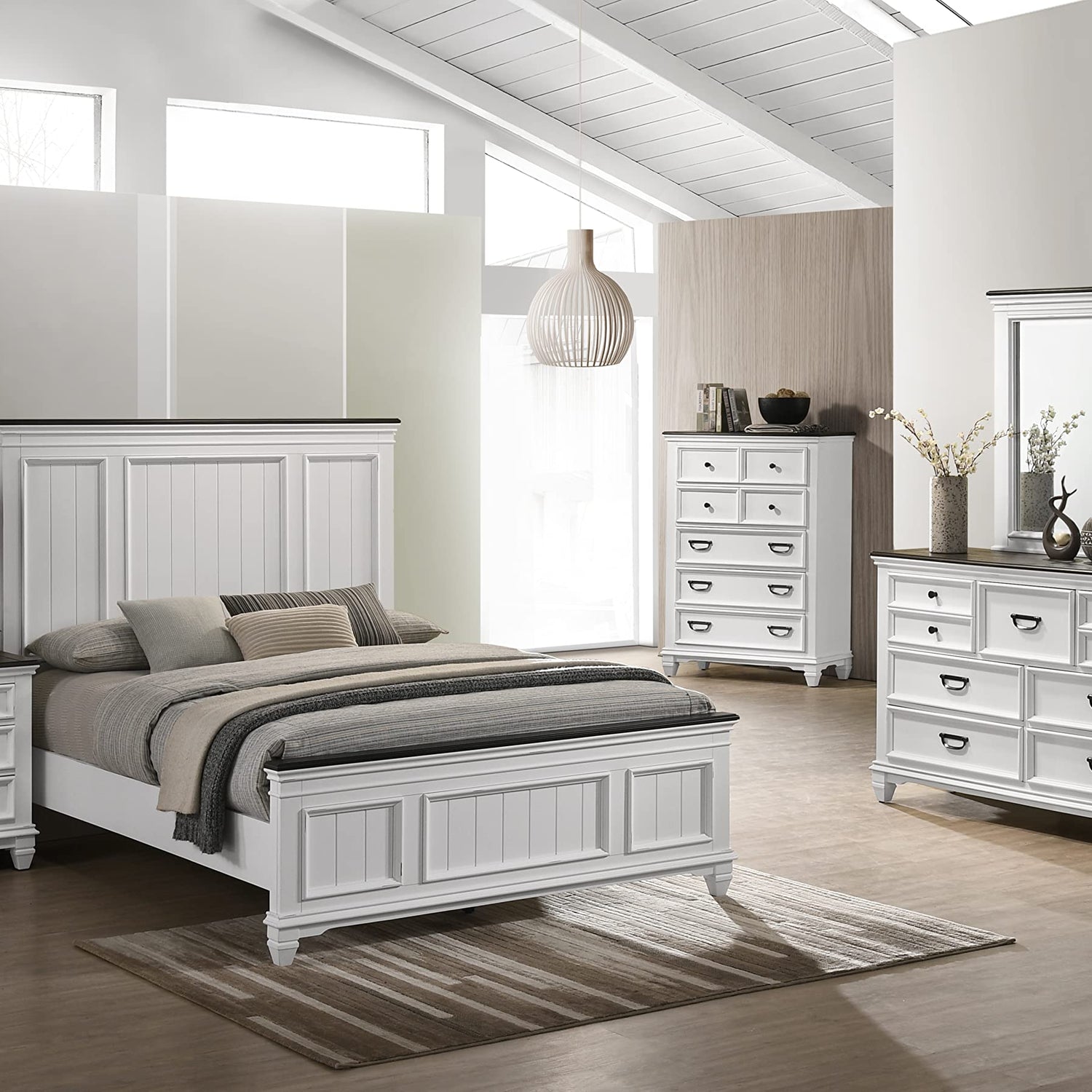 Details: Contemporary shiplap detailing and a weathered white finish mean this Clelane Wood Bedroom Set will give your bedroom a fresh new look. A stylish bed, this one is made of solid tropical wood and laminate with Okoume veneers in a charming weathered white finish. Chic shiplap panels inside carved details with trim molding on the headboard and footboard. The distressed mark, delicate carved trim, and black finished hardware bring a touch of modern farmhouse style to this set. Top drawer is felt-lined. English dovetail drawer construction with full extension metal ball bearing drawer glide.