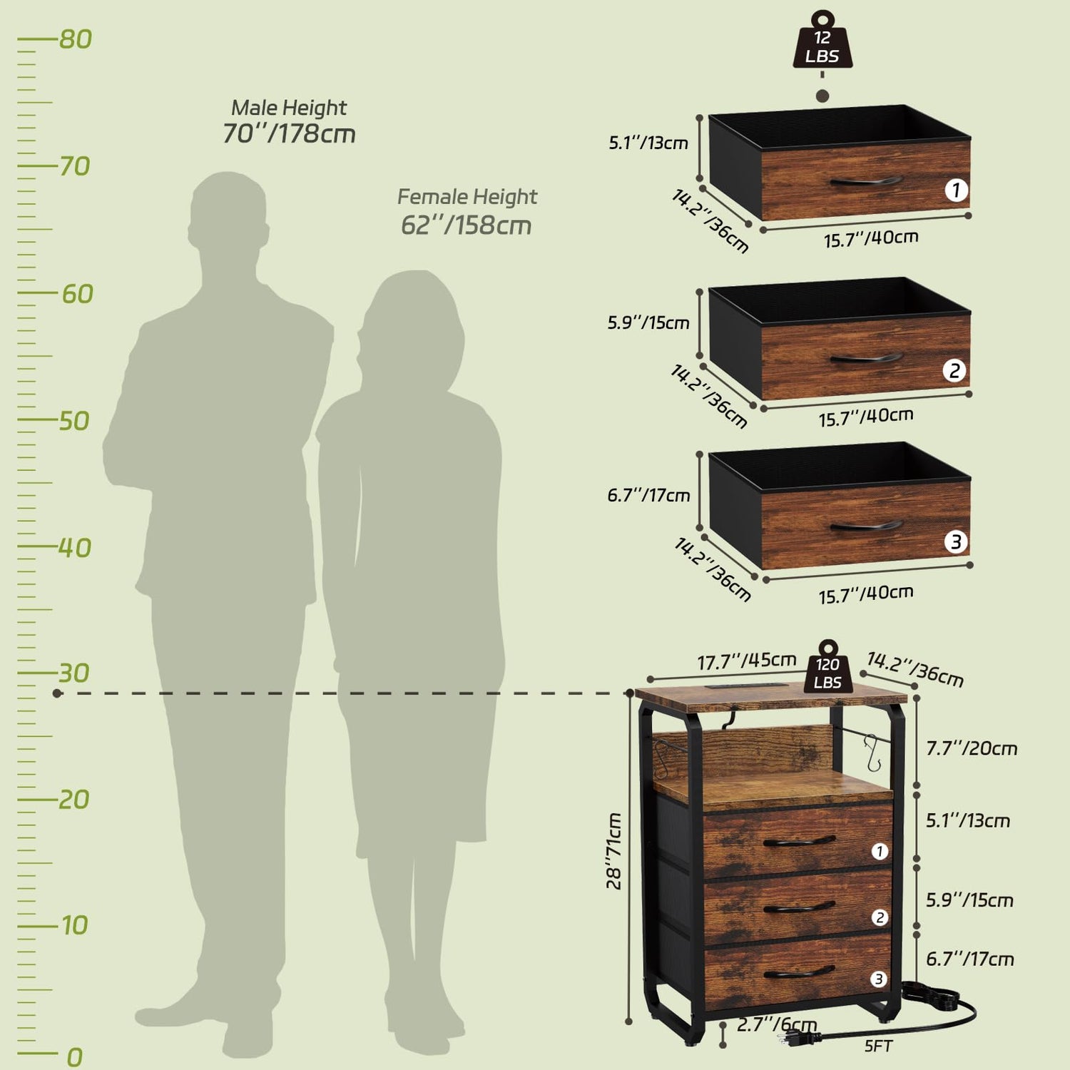 - [Taller & Larger]: Tall bedside table dimension: 14.2"D x 17.7"W x 28"H, offers 3 large fabric drawers, providing ample storage space for personal items such as jewelry, clothes or gifts, bearing up to 12 LBS. Additionally, the end table is equipped with 2 practical metal hooks for hanging items, ensuring a neat and organized bedside space