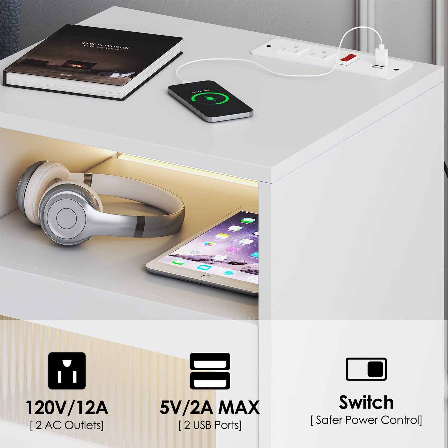 - ⬜【Nightstand with Charging Station】2 standard plug outlets + 2 USB ports, supplying power for the light strip, table lamp and speaker; you can also charge cell phone, tablets, smart watch, etc; Just say goodbye to 'Low Battery Anxiety' when playing with your phone in bed or sofa