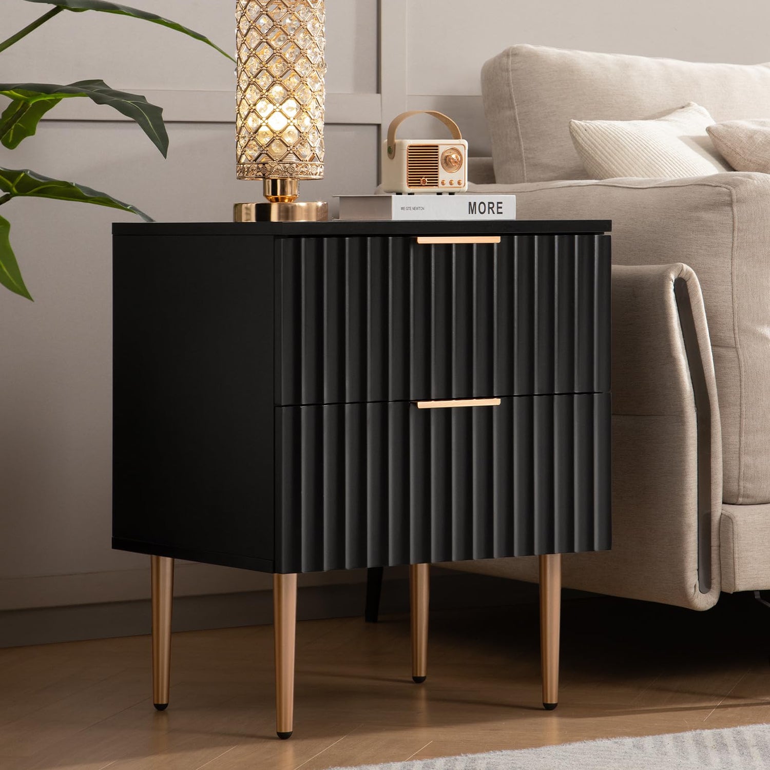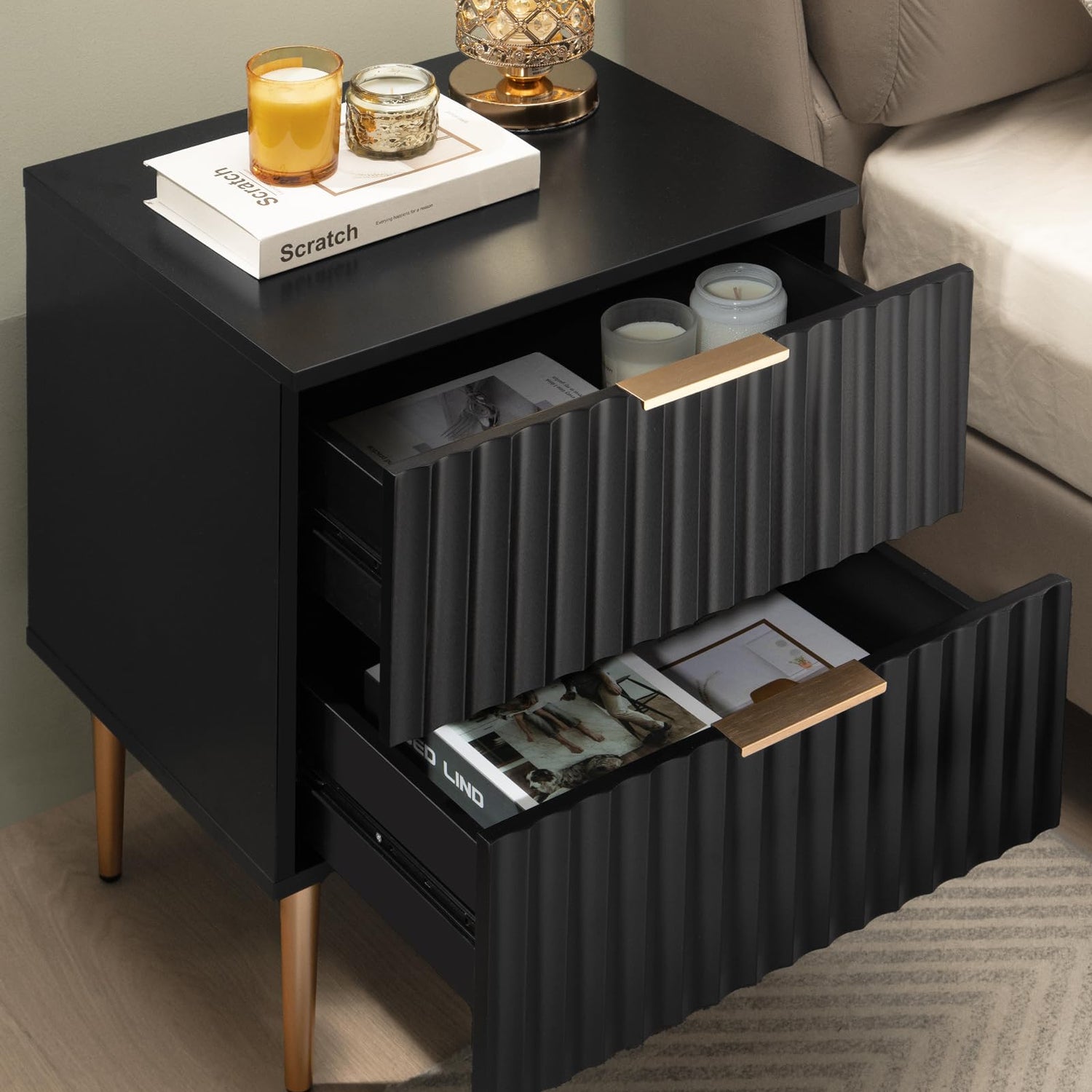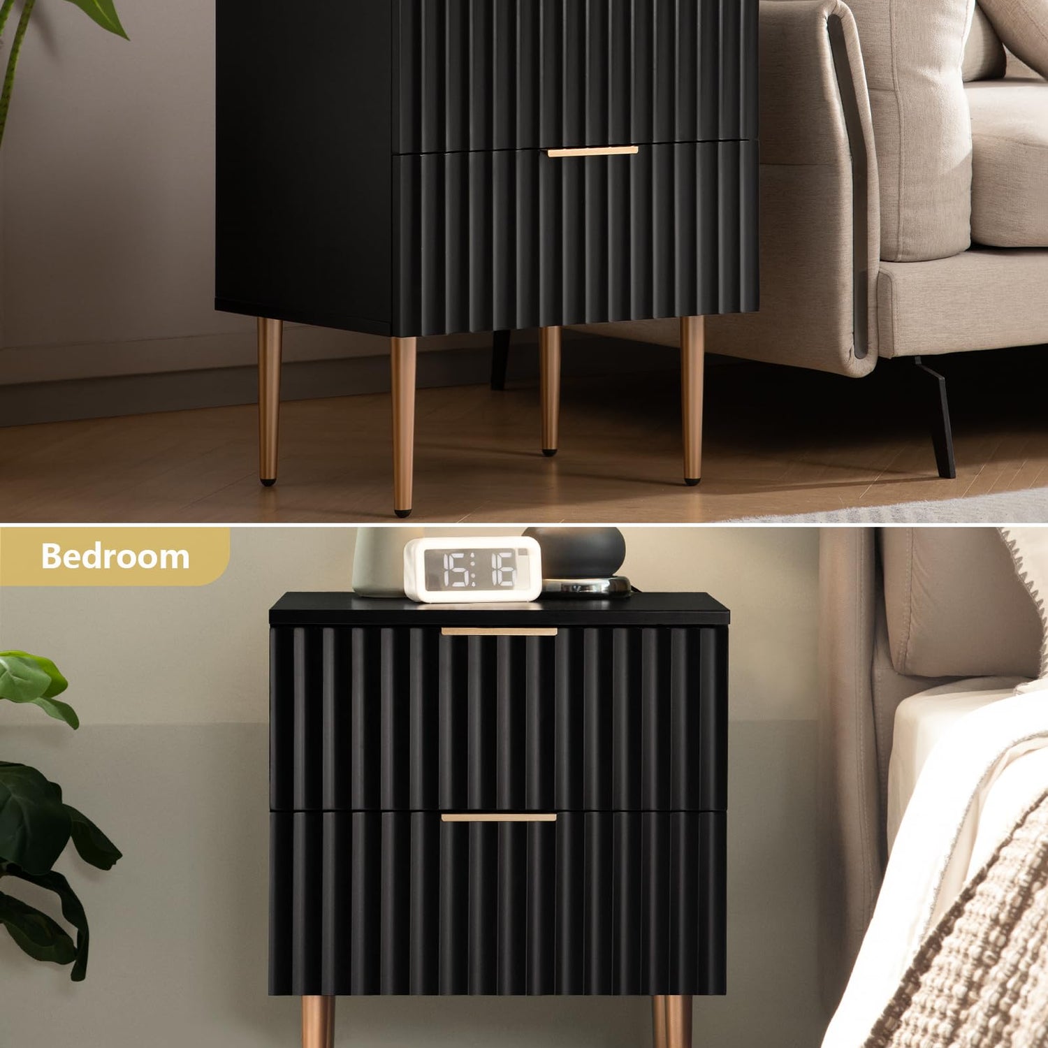 SICOTAS Black Night Stand Set 2, Wide Fluted Nightstand with 2 Drawers, Modern Glossy Storage Bedside Table for Bedroom, End Side Table with Golden Metal Legs and Handles