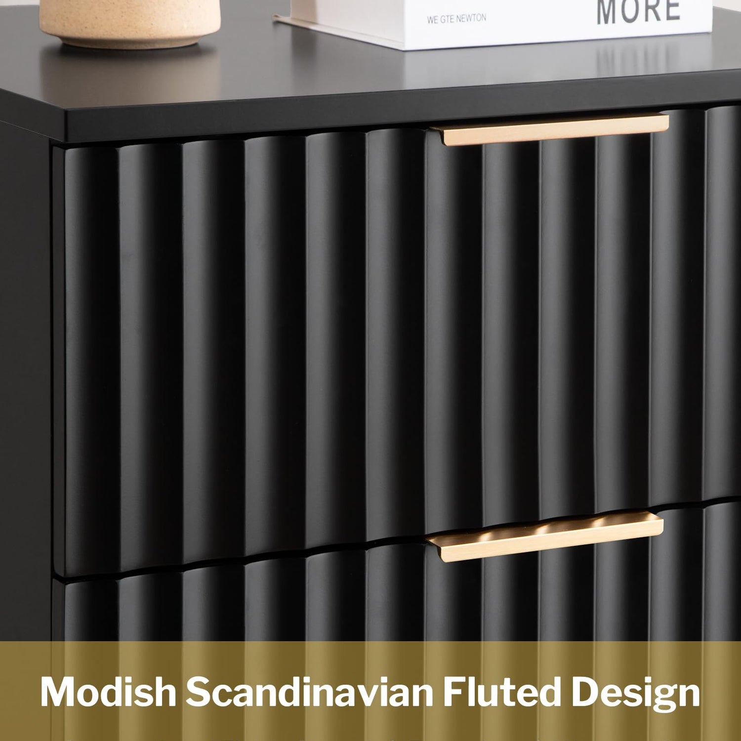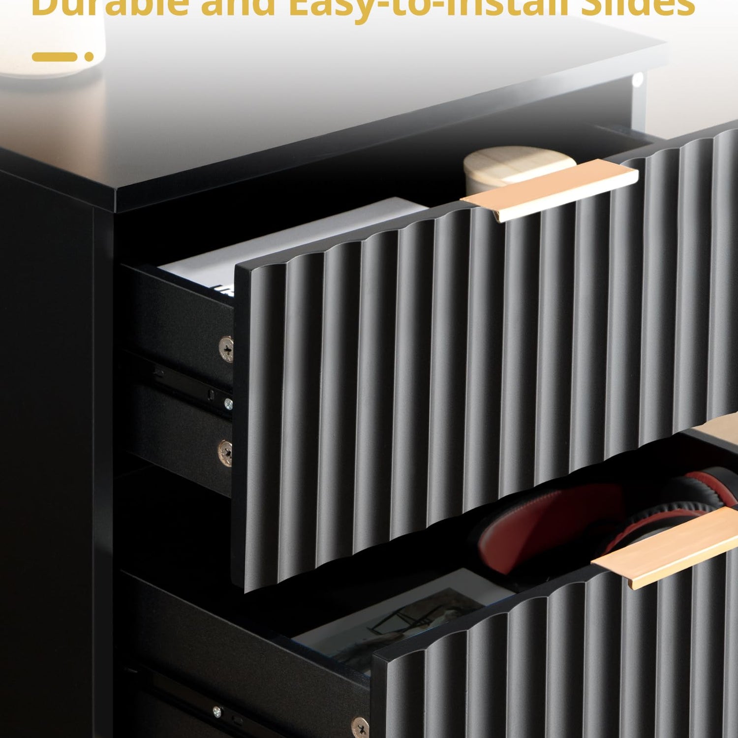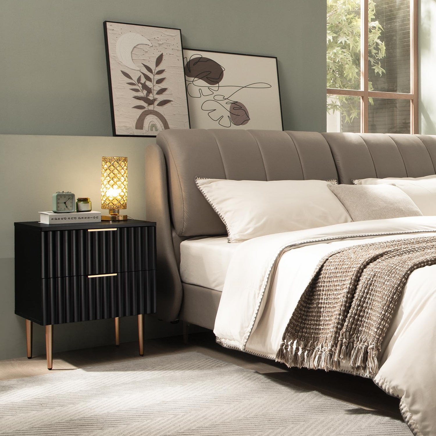 SICOTAS Black Night Stand Set 2, Wide Fluted Nightstand with 2 Drawers, Modern Glossy Storage Bedside Table for Bedroom, End Side Table with Golden Metal Legs and Handles