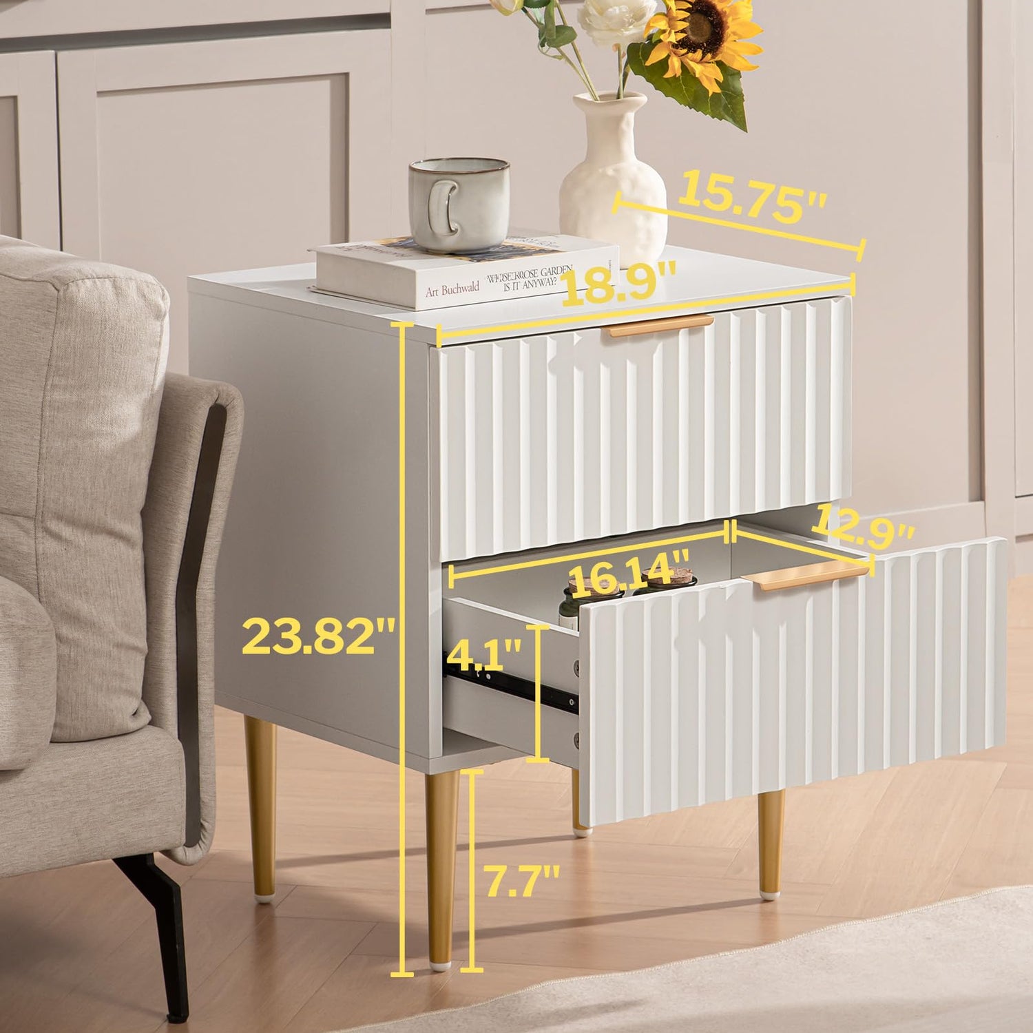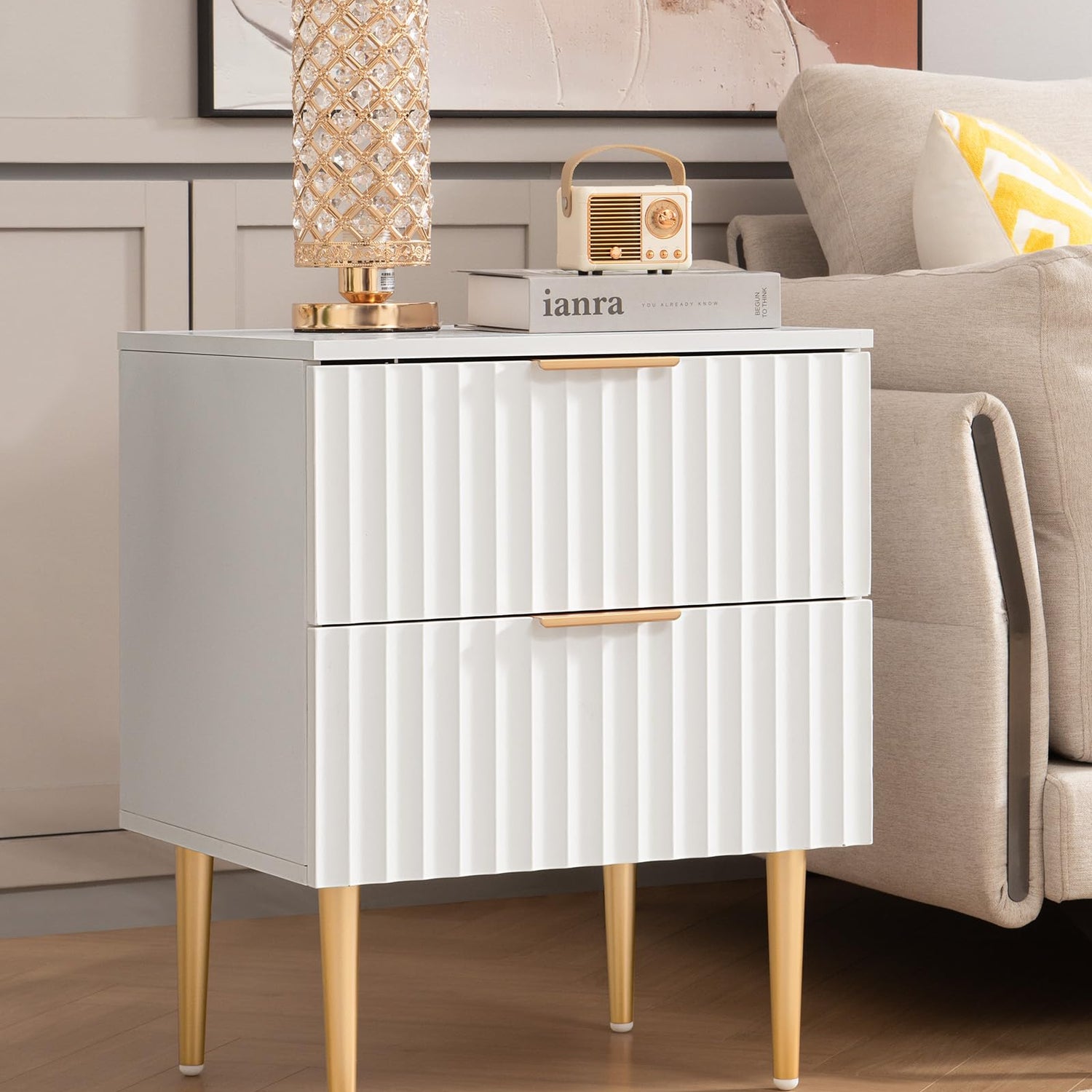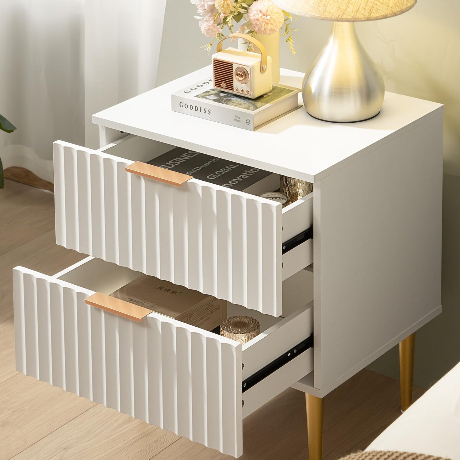 SICOTAS White Night Stand Set 2, Wide Fluted Nightstand with 2 Drawers, Modern Glossy Storage Bedside Table for Bedroom, End Side Table with Golden Metal Legs and Handles(2, White)