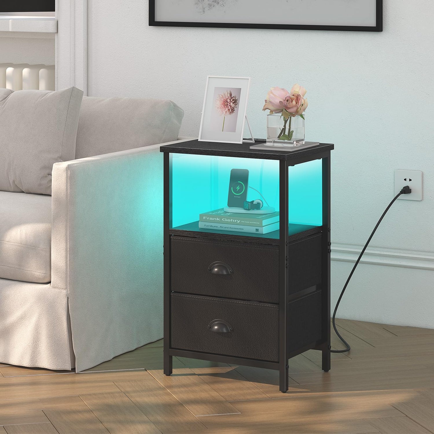 sthmec Nightstand with Charging Station, Night Stand with 2 Fabric Drawers PU Finish, Bedside Table End Table with LED Light, 3-Tier Storage Side Table Nightstand with Drawers for Bedroom,Black