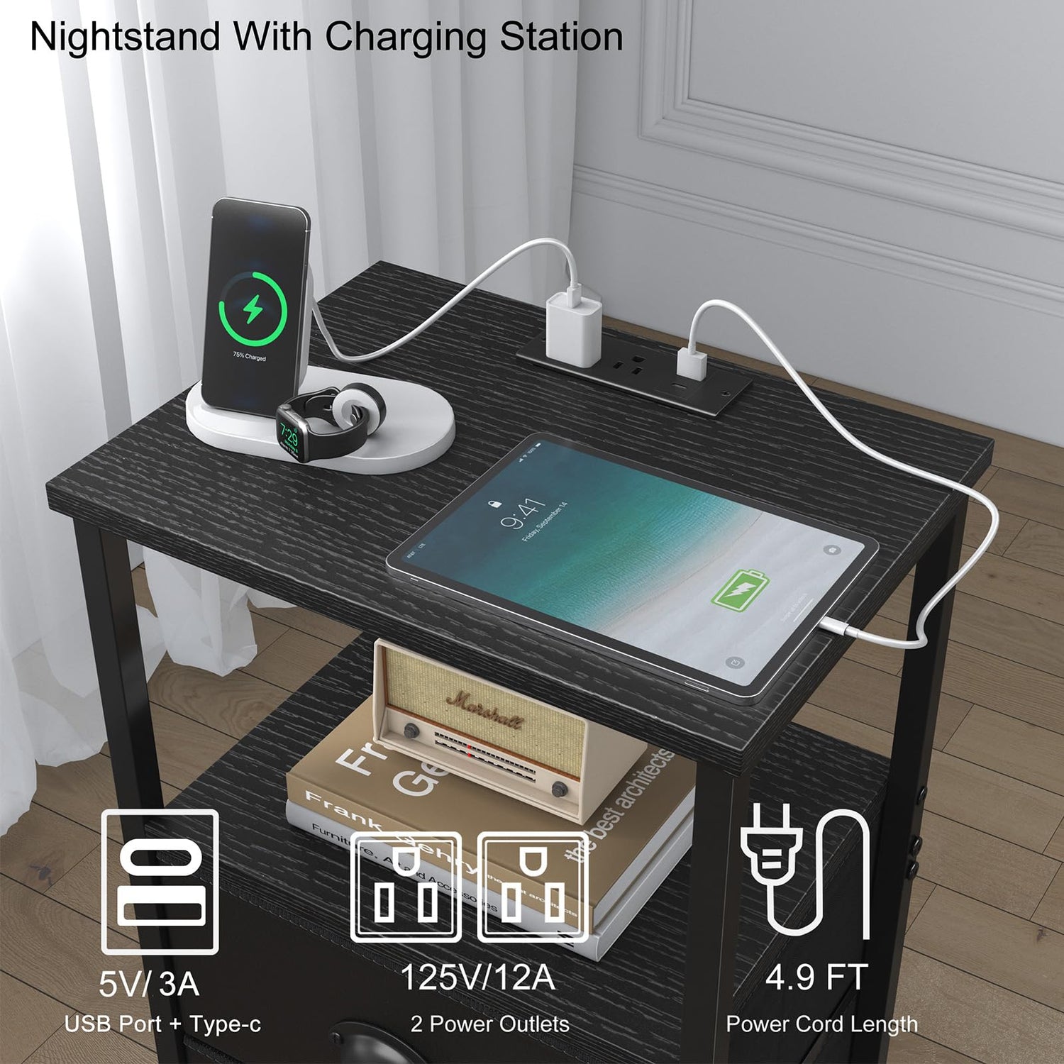 - Night Stand with Charging Station: Sthmec night stand with size : 11.38''D * 15.38''W* 24.75''H ,And night stand with charger station comes with built-in 2 outlets,1 USB port and 1 Type-C port ,which is access to charge devices while sleeping,energy always by your side,Meanwhile the 4.9 ft extension cord is more convenient charging ports for multiple useage