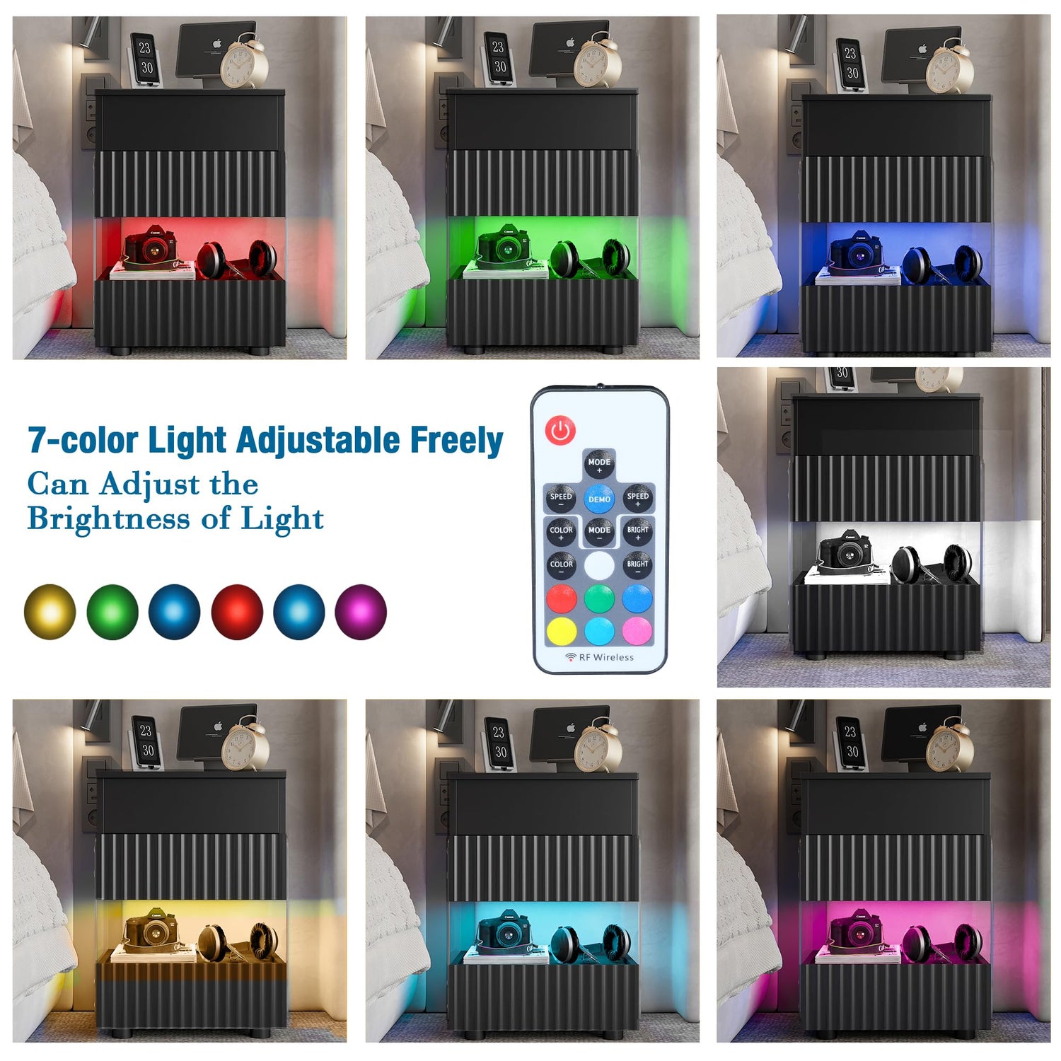 - 7-Color LED Lights with Remote: Customize your ambiance! Adjust brightness & switch between 7 vibrant colors via remote (no motion sensor). Soft glow for nighttime safety or mood lighting. Phantom decor nightstand with secret compartment