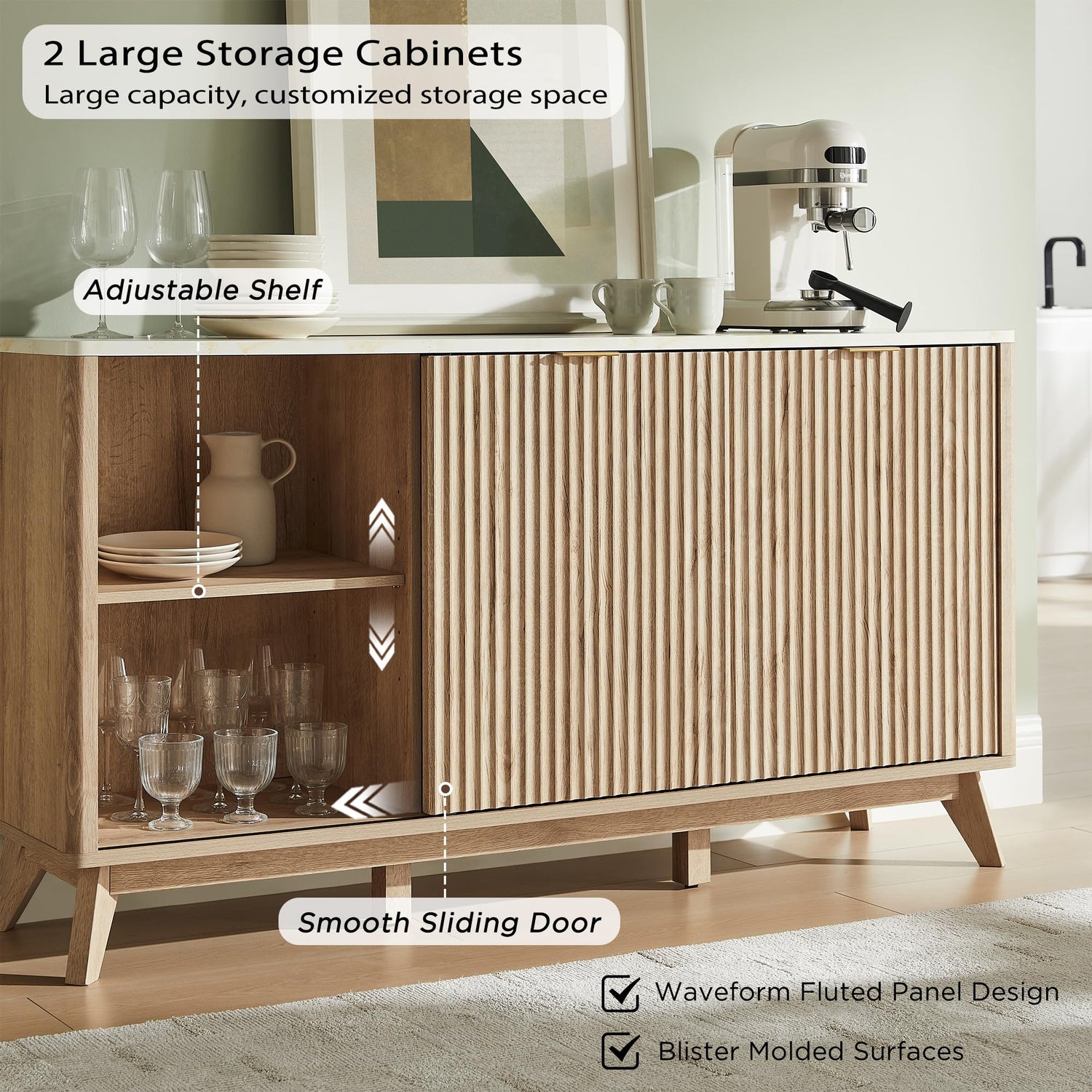 T4TREAM Fluted Buffet Cabinet, 60" Modern Sideboard with Sliding Doors & 4 Drawers, Coffee Bar Table with Storage, Faux Marble Top and Curved Profile Design for Dining Room, Living Room, Natural Oak