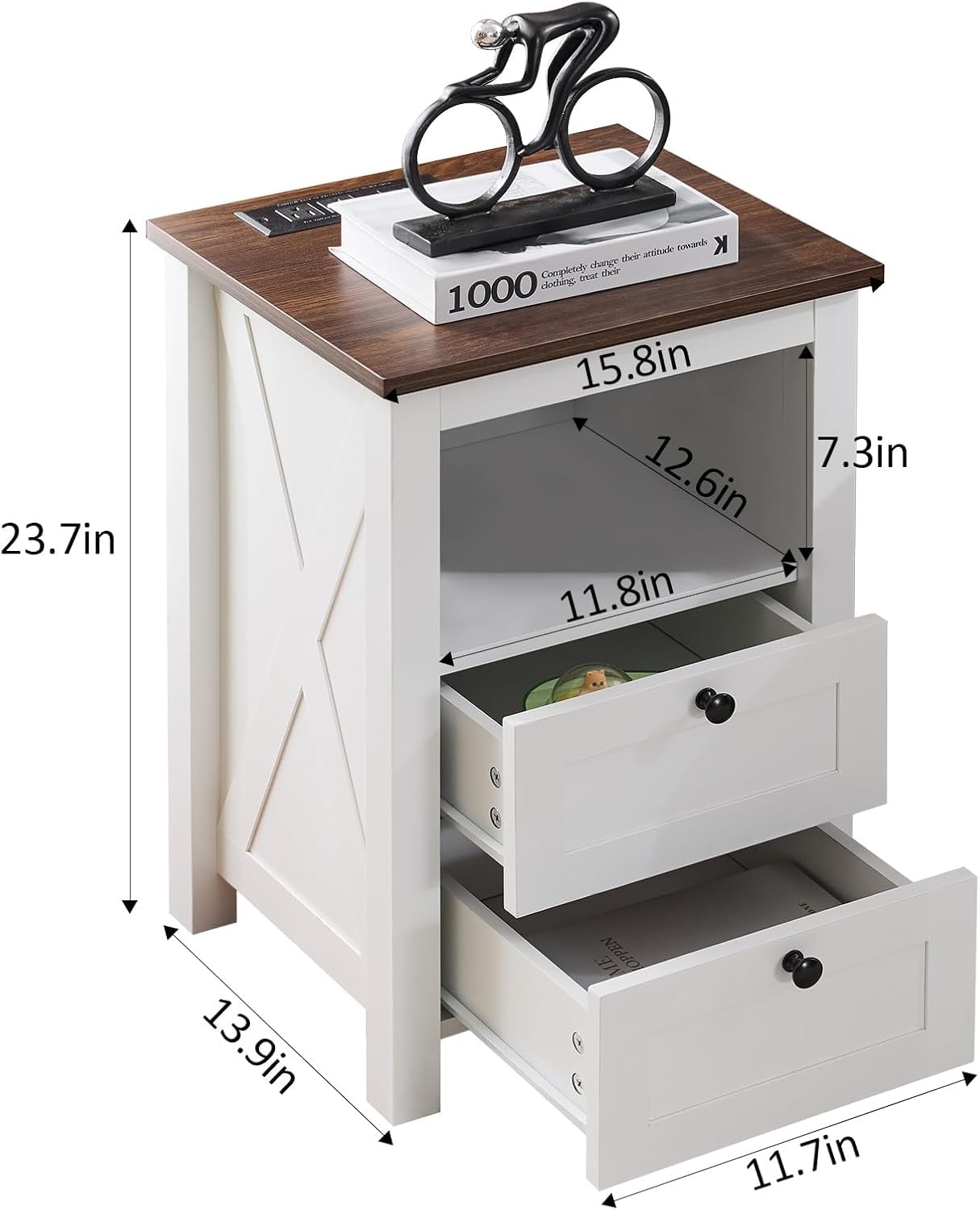 TrustKare Farmhouse Nightstand, White Nightstand with Charging Station and LED Lighting, Wood End Table with 2 Drawers, Smart Farmhouse Design Bedside Table for Bedroom Living Room