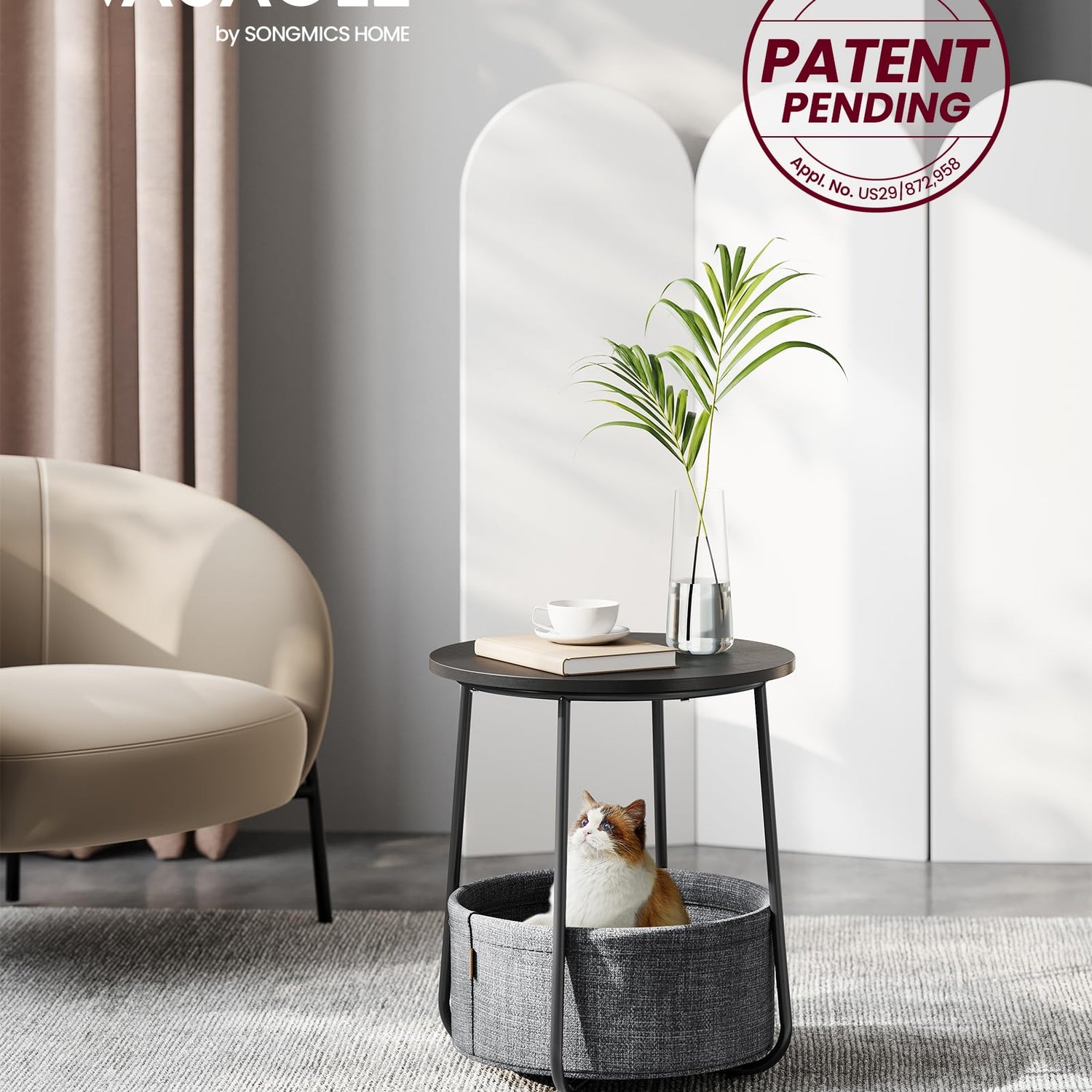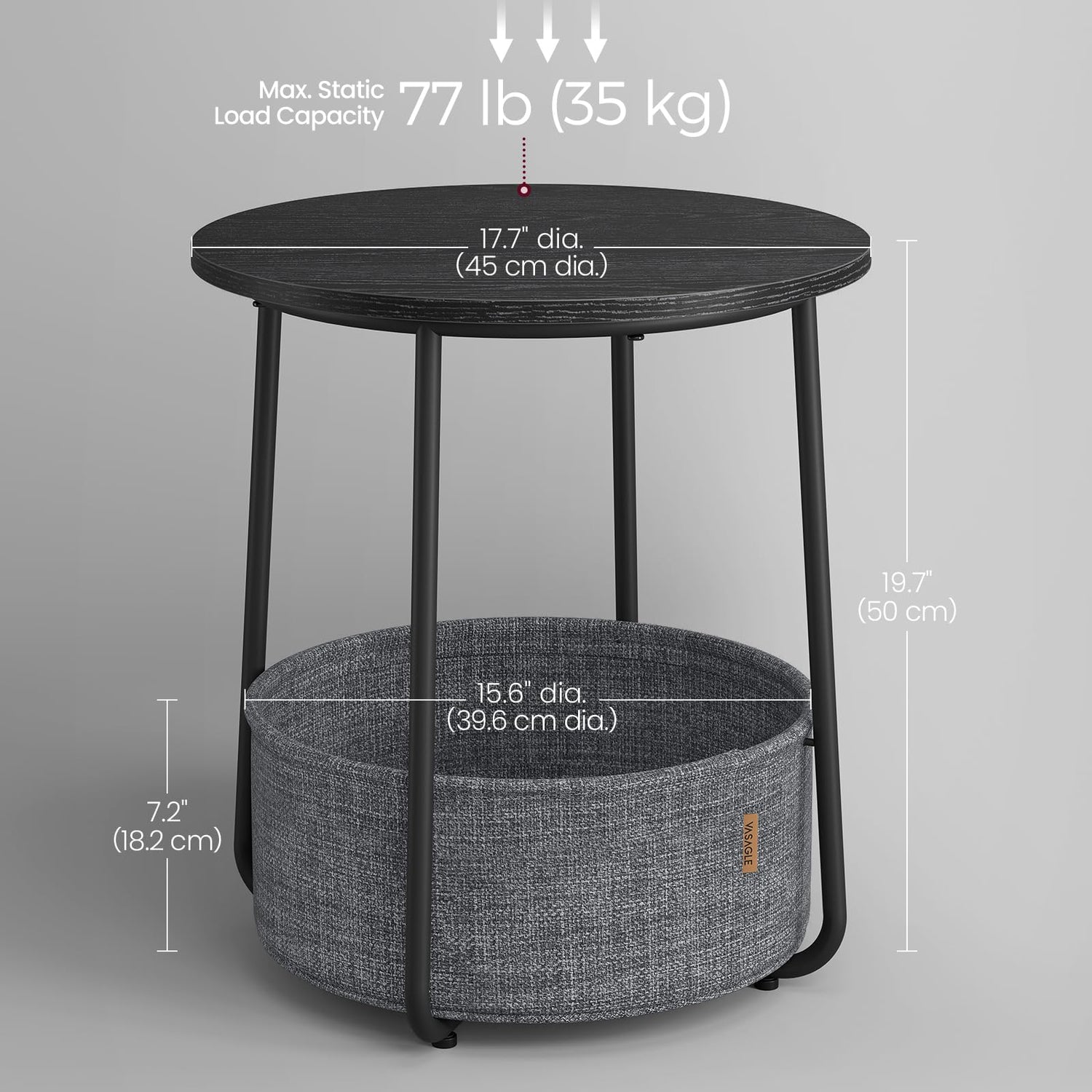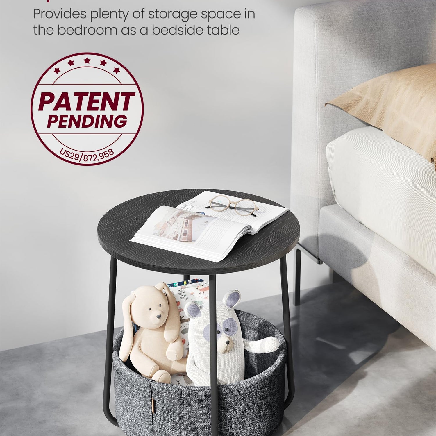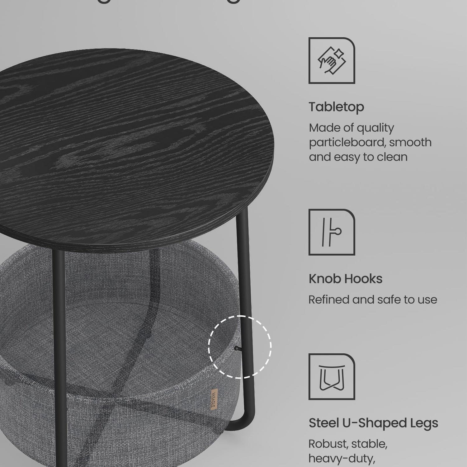 VASAGLE End Table, Small Bedside Table with Fabric Basket, Modern Nightstand, Round Side Table, for Living Room, Bedroom, Ebony Black and Slate Gray ULET223B01