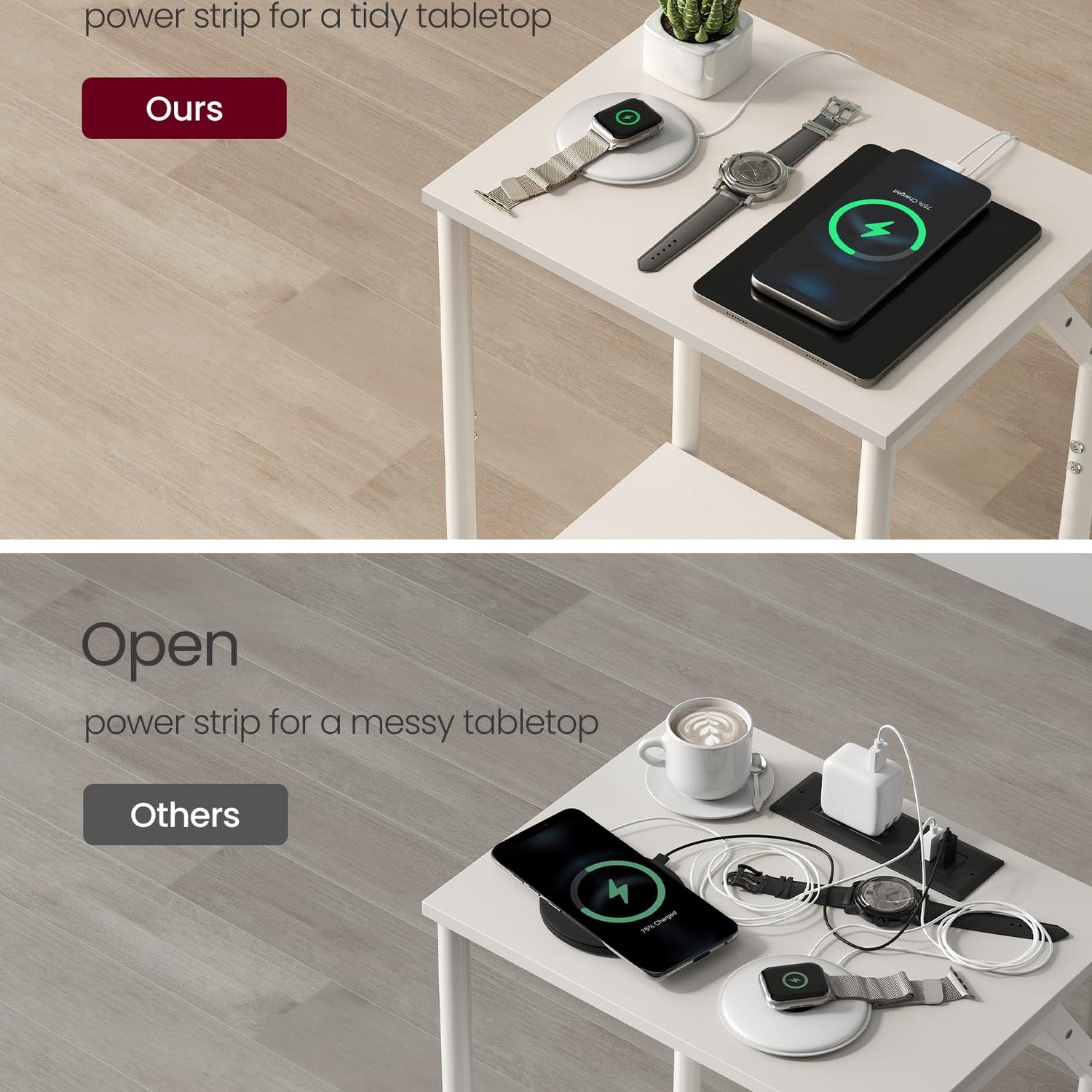 - [Side Tables with Charging Stations] Low battery? Charge your devices with these small tables featuring two AC outlets, two USB ports, and a 6.5 ft cord each. Also, the proper distances between outlets ensure you can use all of them at the same time