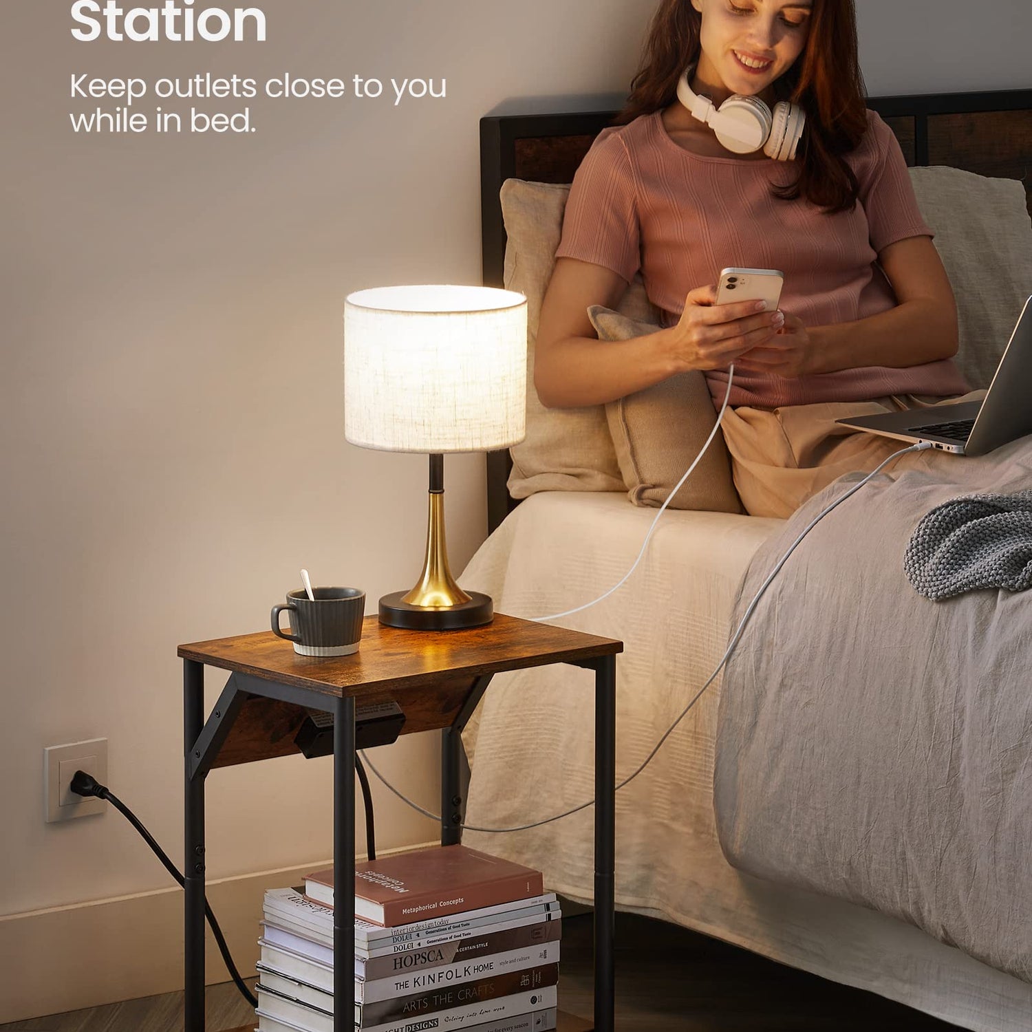 - [Side Table with Charging Station] Low battery? Charge your devices with this small table featuring two AC outlets, two USB ports, and a 6.5 ft cord. Also, the proper distances between outlets ensure you can use all of them at the same time
