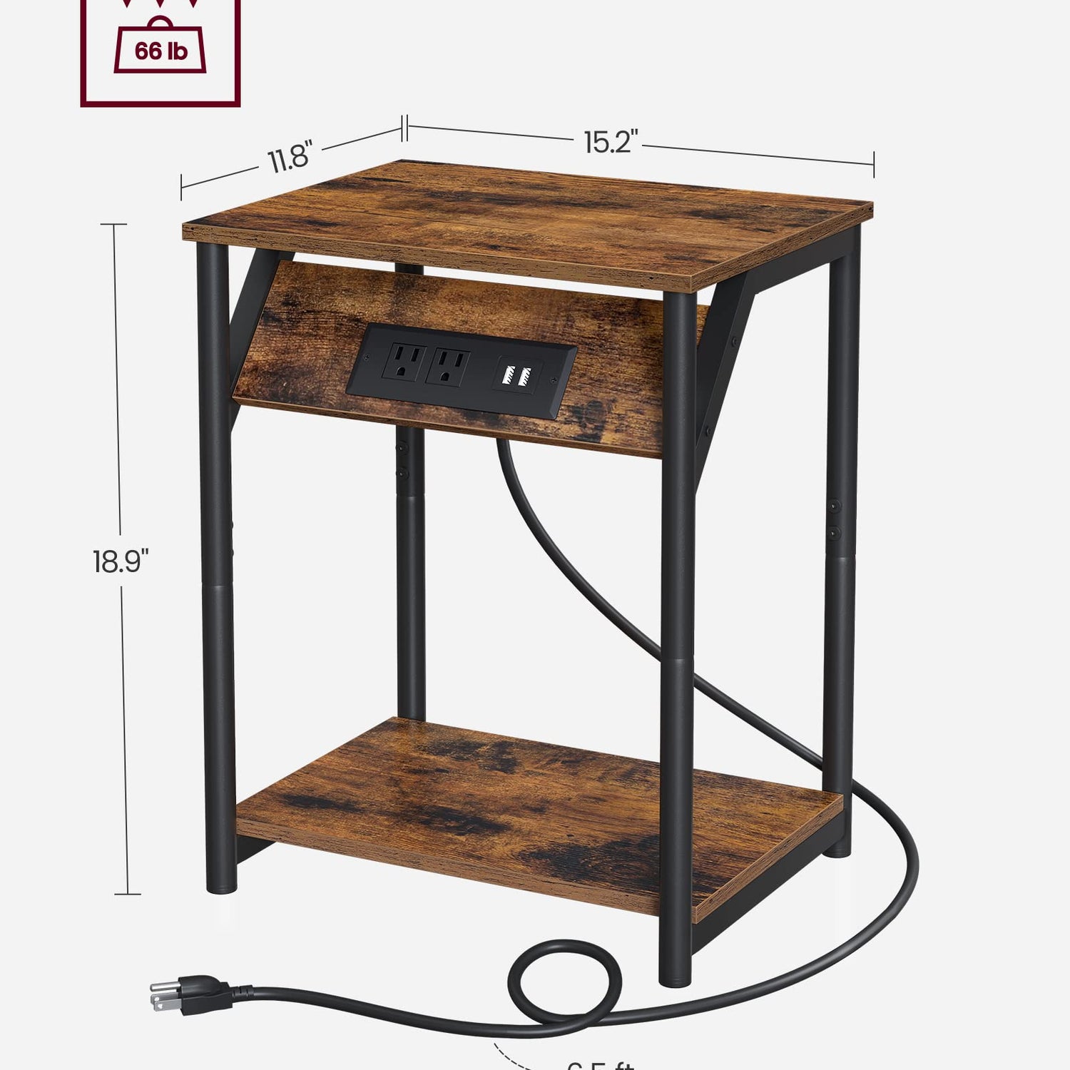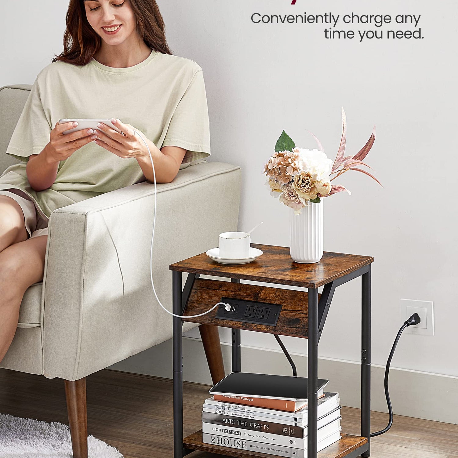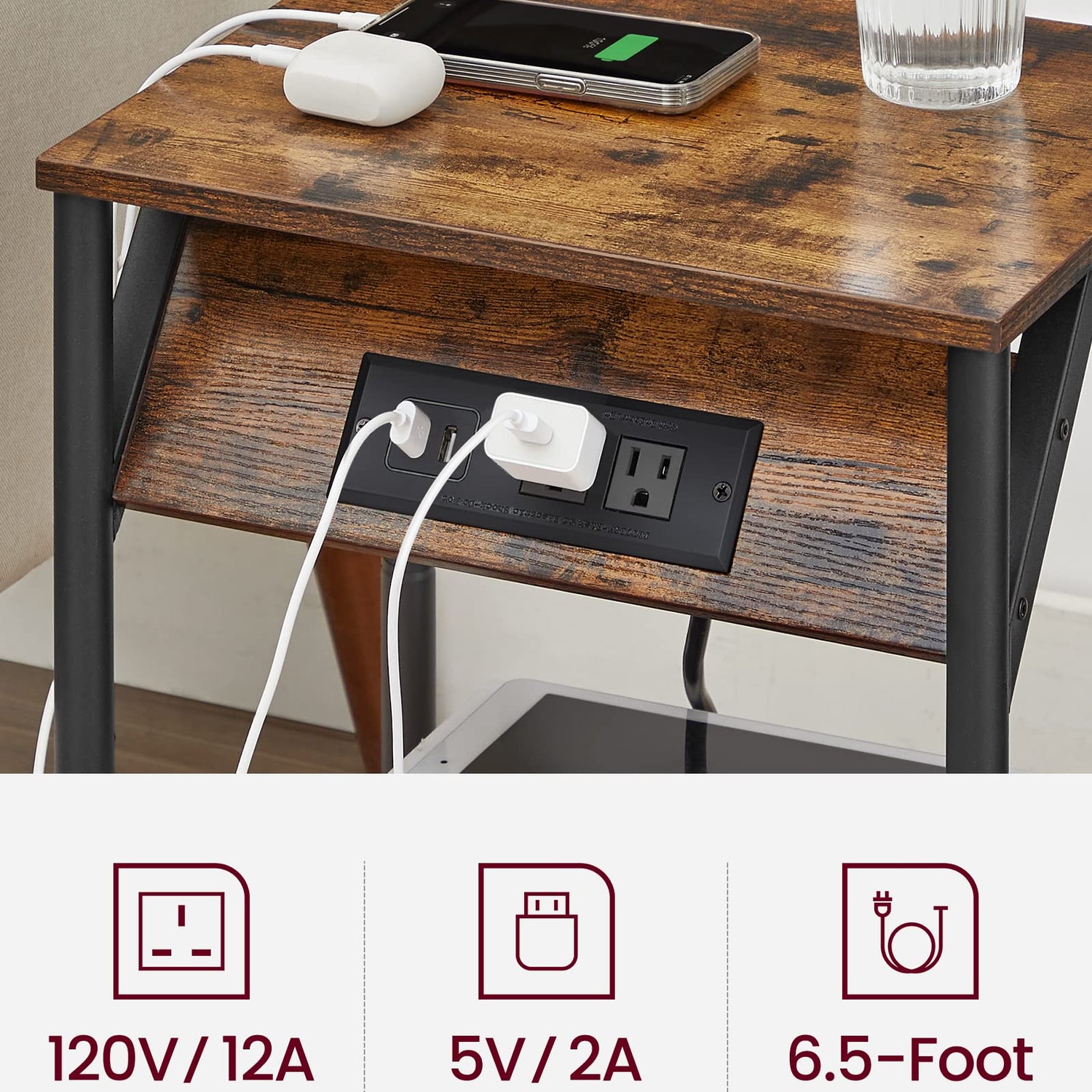 VASAGLE End Table with Charging Station, Small Side Table for Living Room, Bedroom, Nightstand with Outlets and USB Ports, Bedside Table with Storage Shelf, Rustic Brown and Black