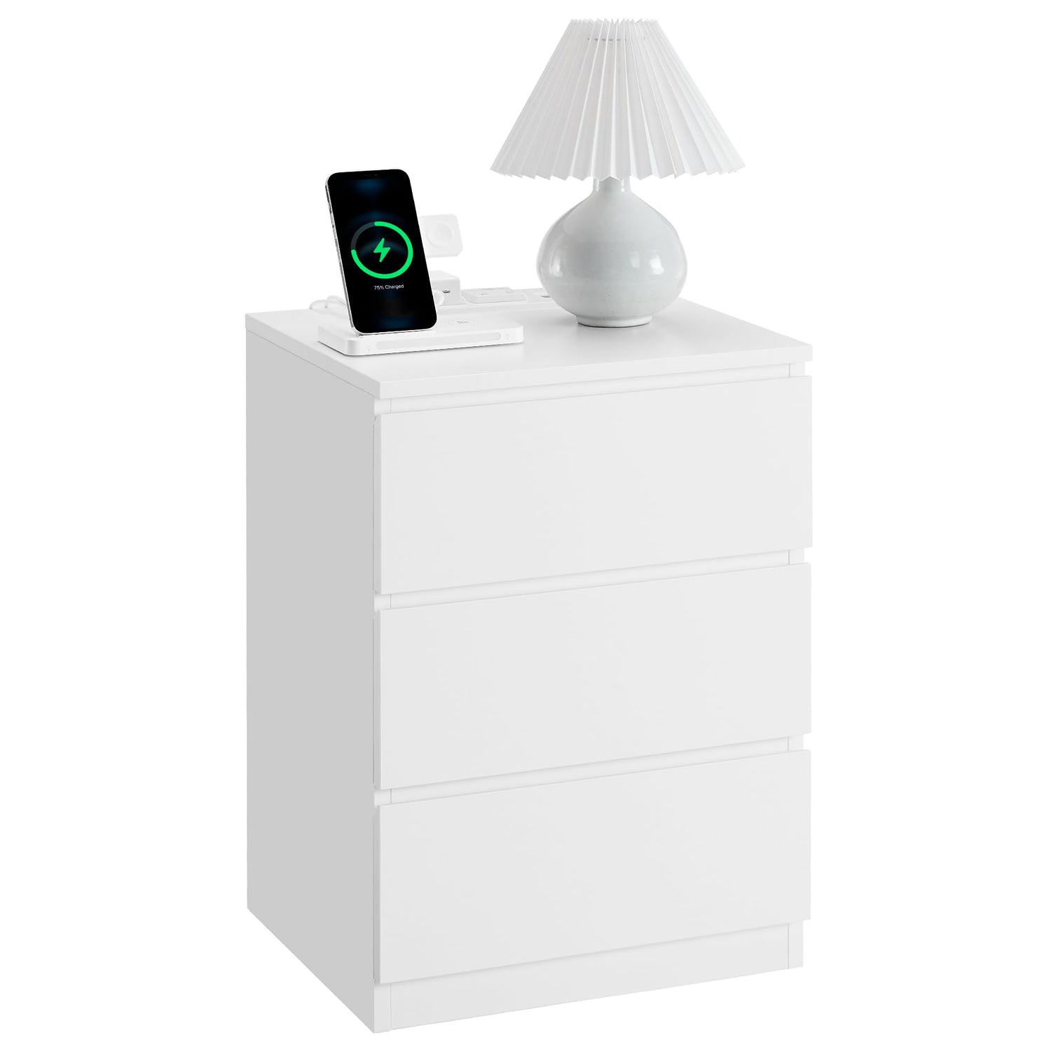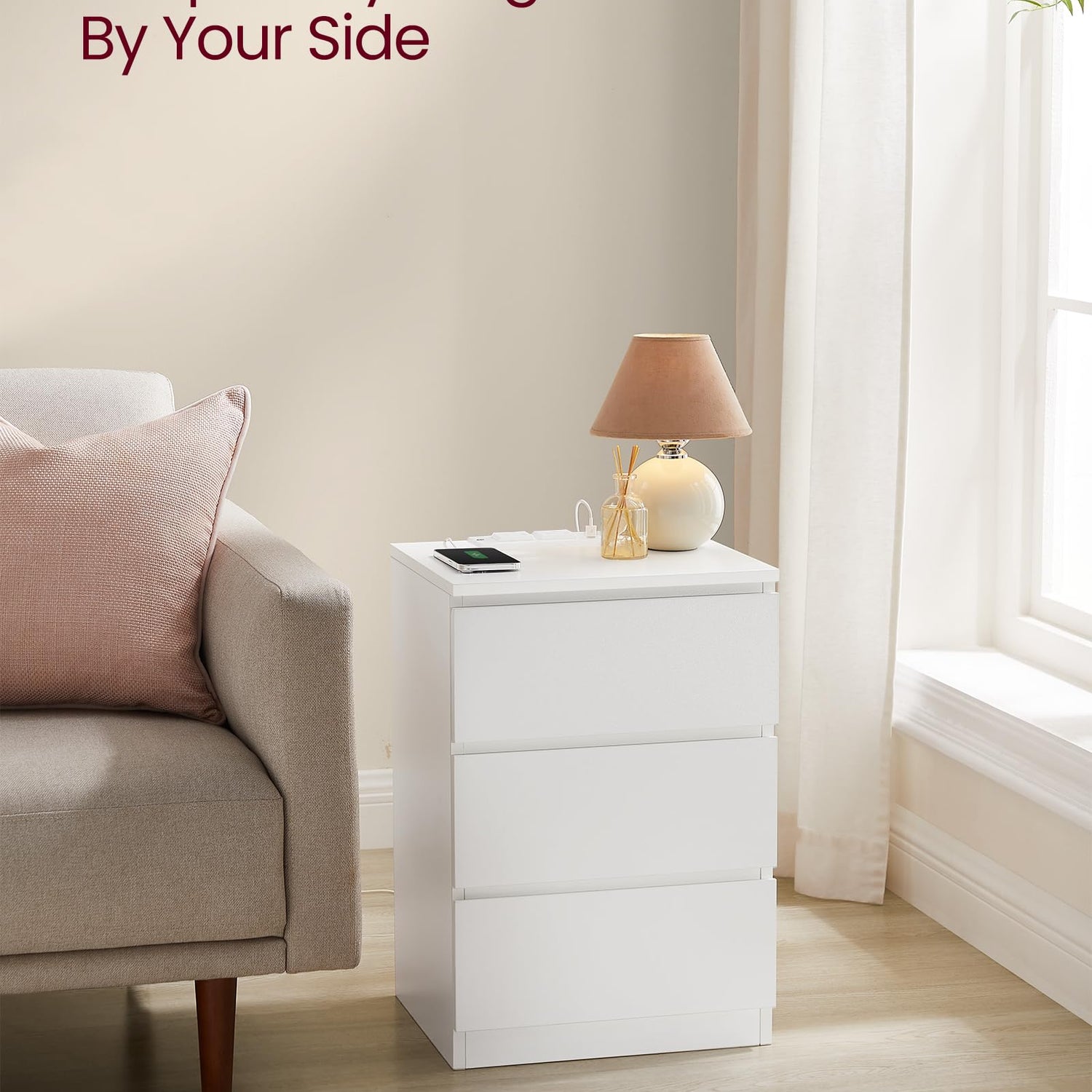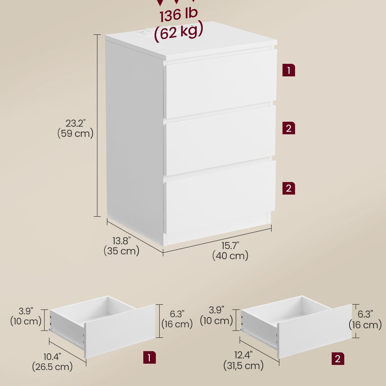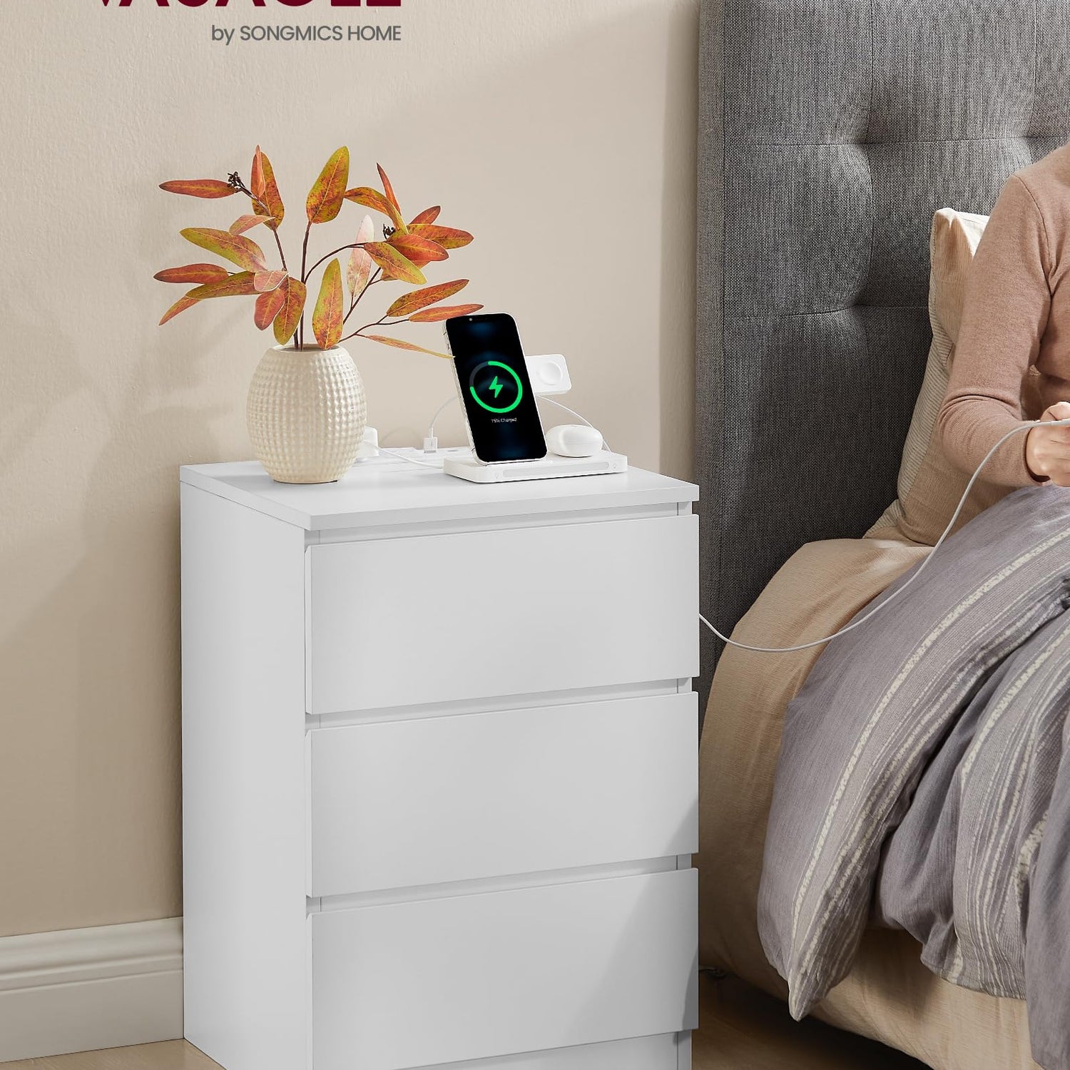 VASAGLE Nightstand with Charging Station, 2 AC Outlets and 2 USB Ports, Bedside Table, Side Table with 3 Drawers, Modern Style, 13.8 x 15.7 x 23.2 Inches, Cloud White ULET631W16