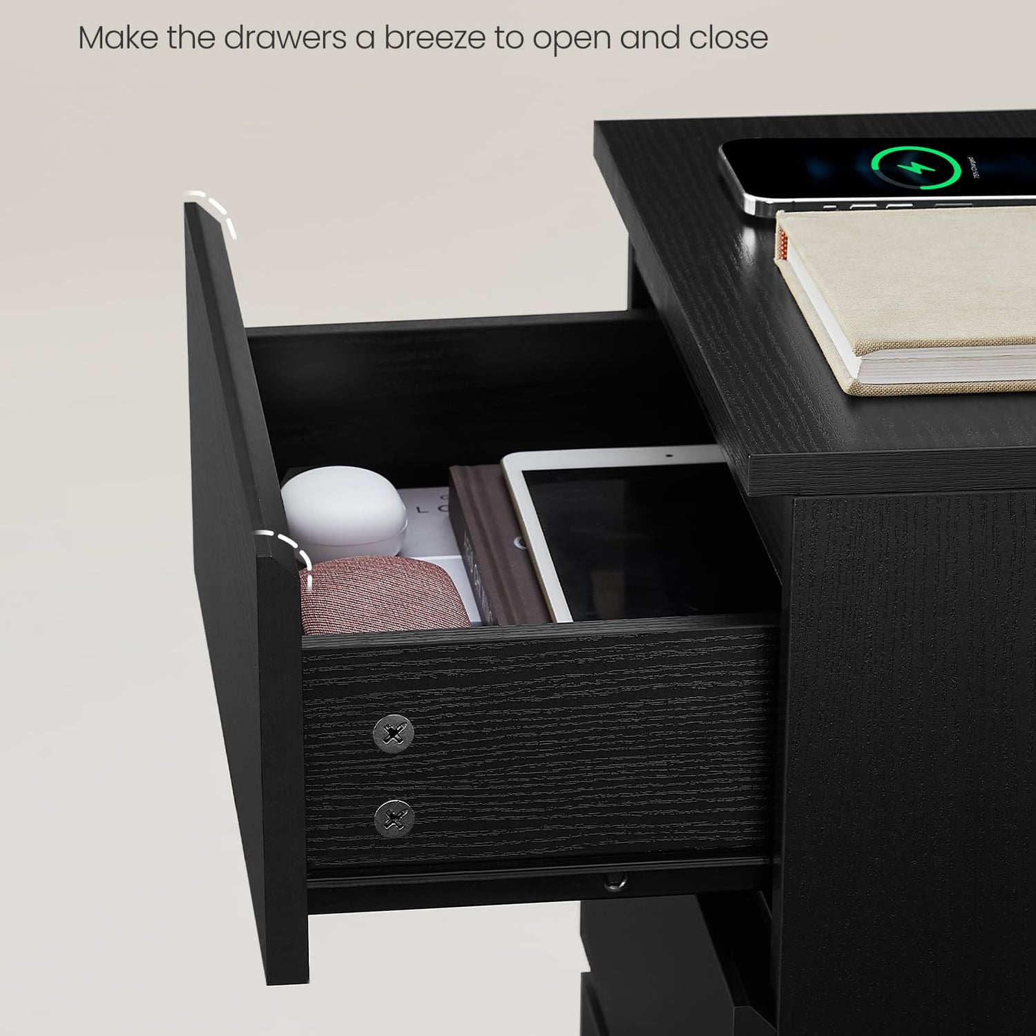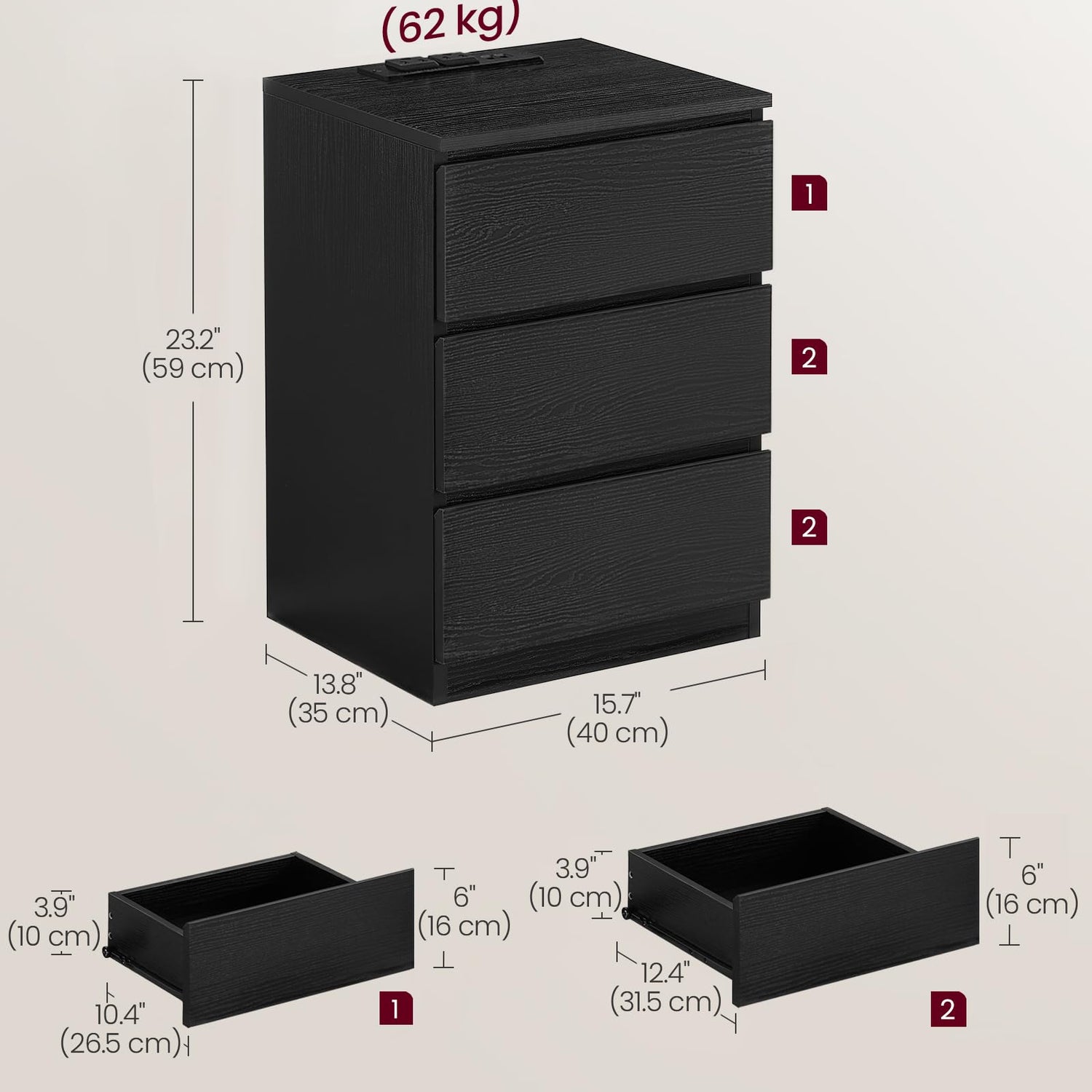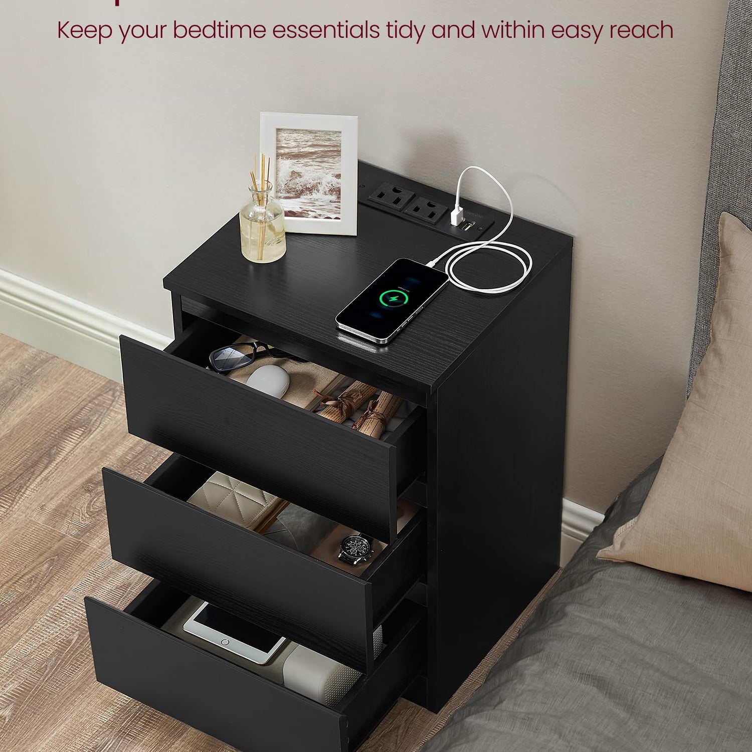 VASAGLE Nightstand with Charging Station, 2 AC Outlets and 2 USB Ports, Bedside Table, Side Table with 3 Drawers, Modern Style, 13.8 x 15.7 x 23.2 Inches, Ebony Black ULET631B58