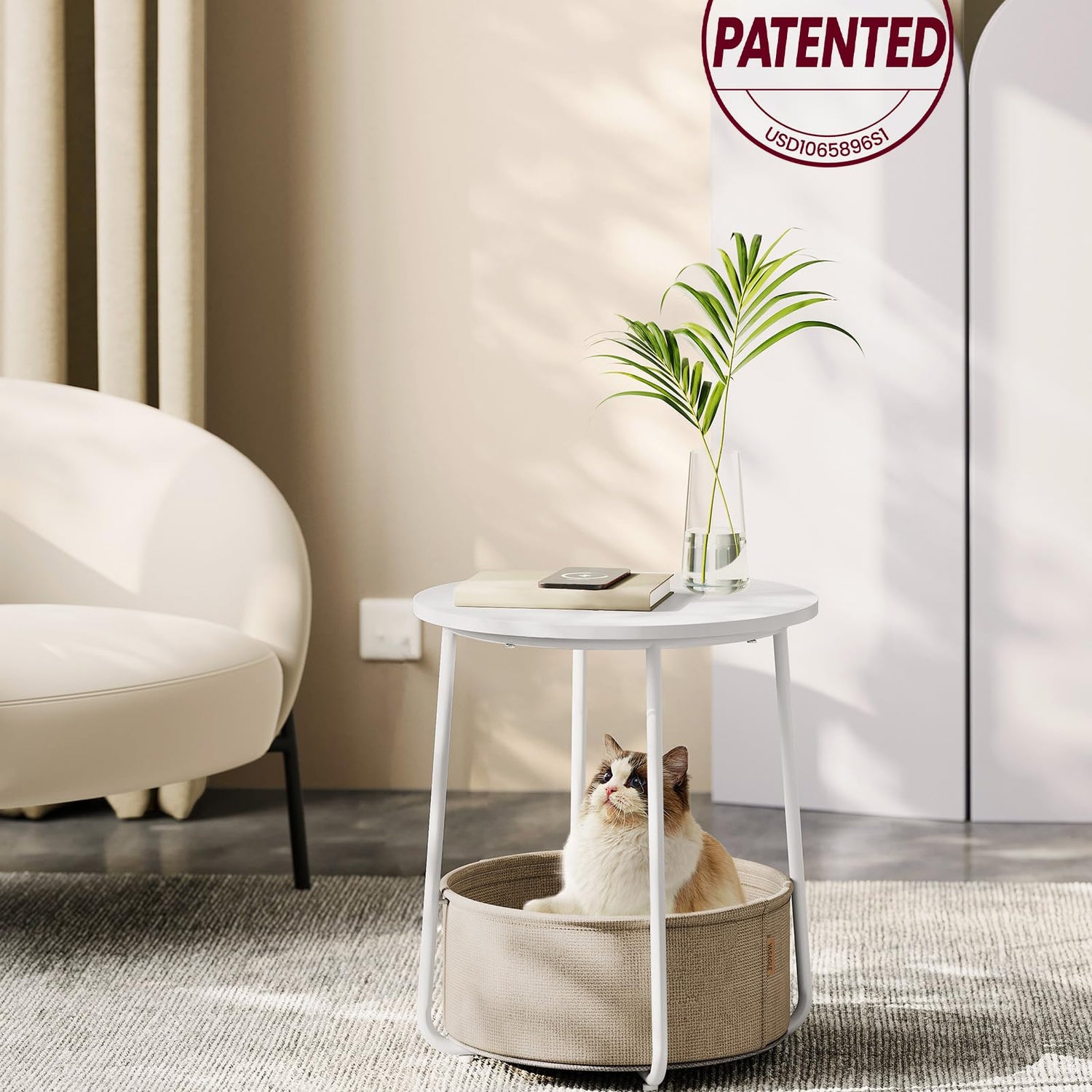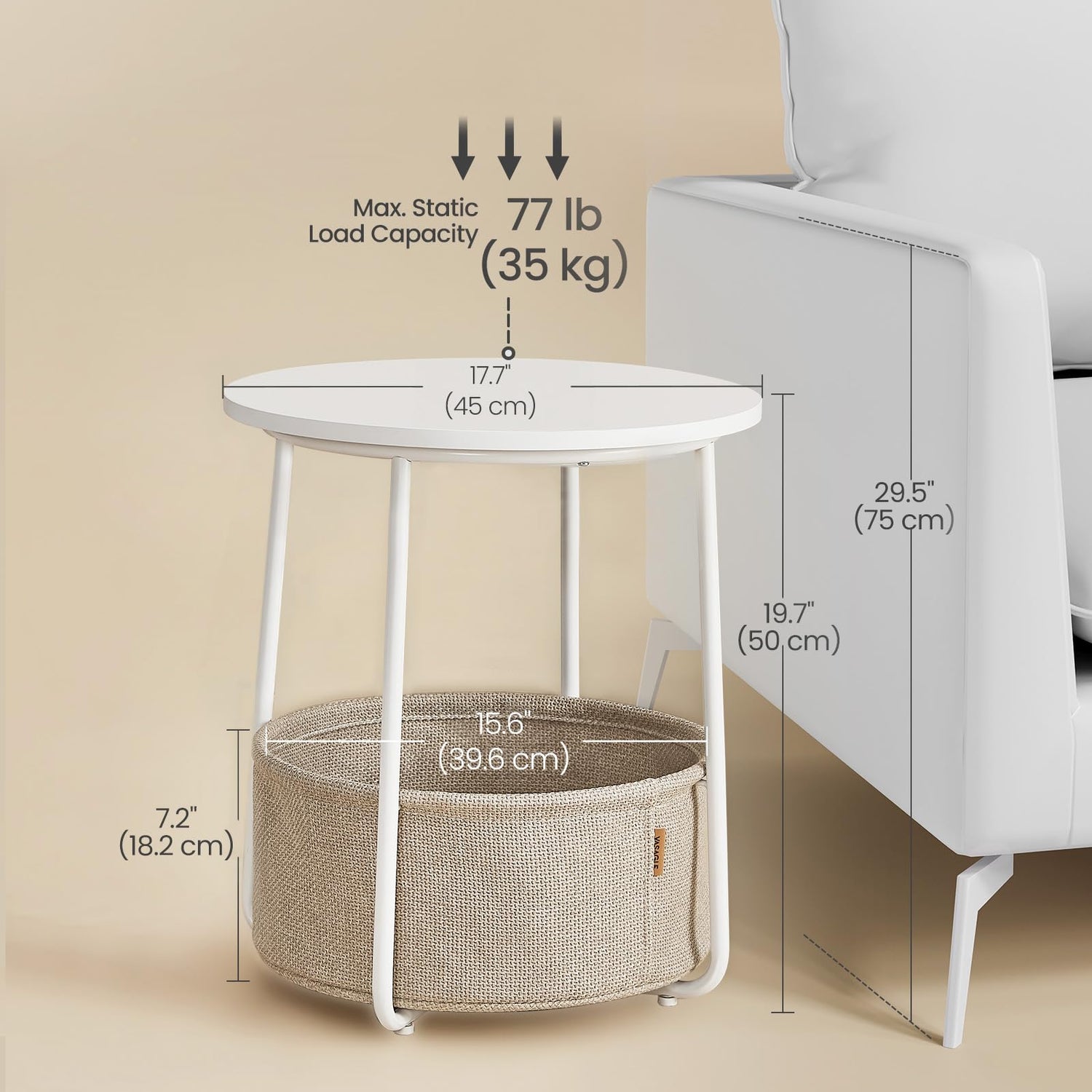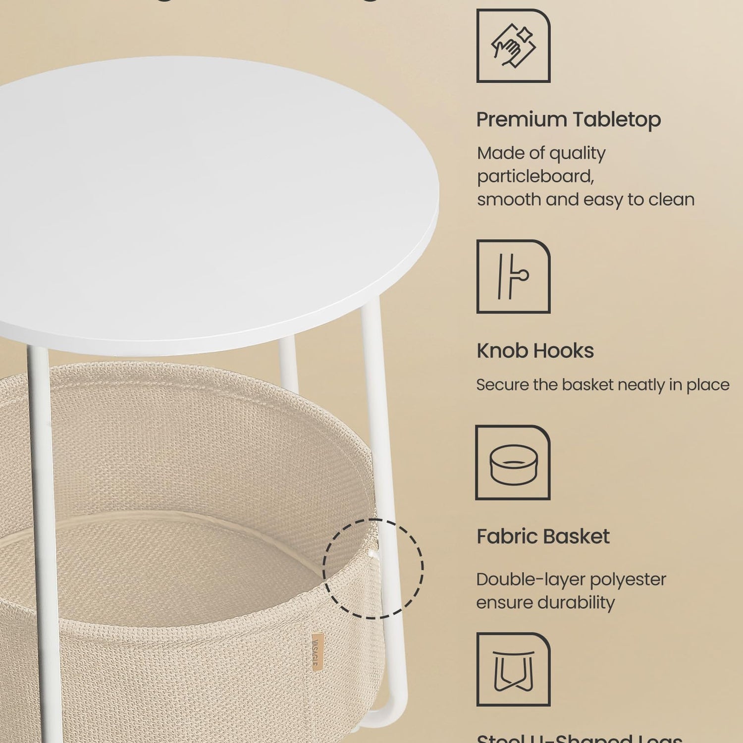 VASAGLE Nightstands, Set of 2 Small Round Side Tables with Fabric Basket, Bedside End Tables, for Bedroom, Matte White and Camel Brown ULCT665W01