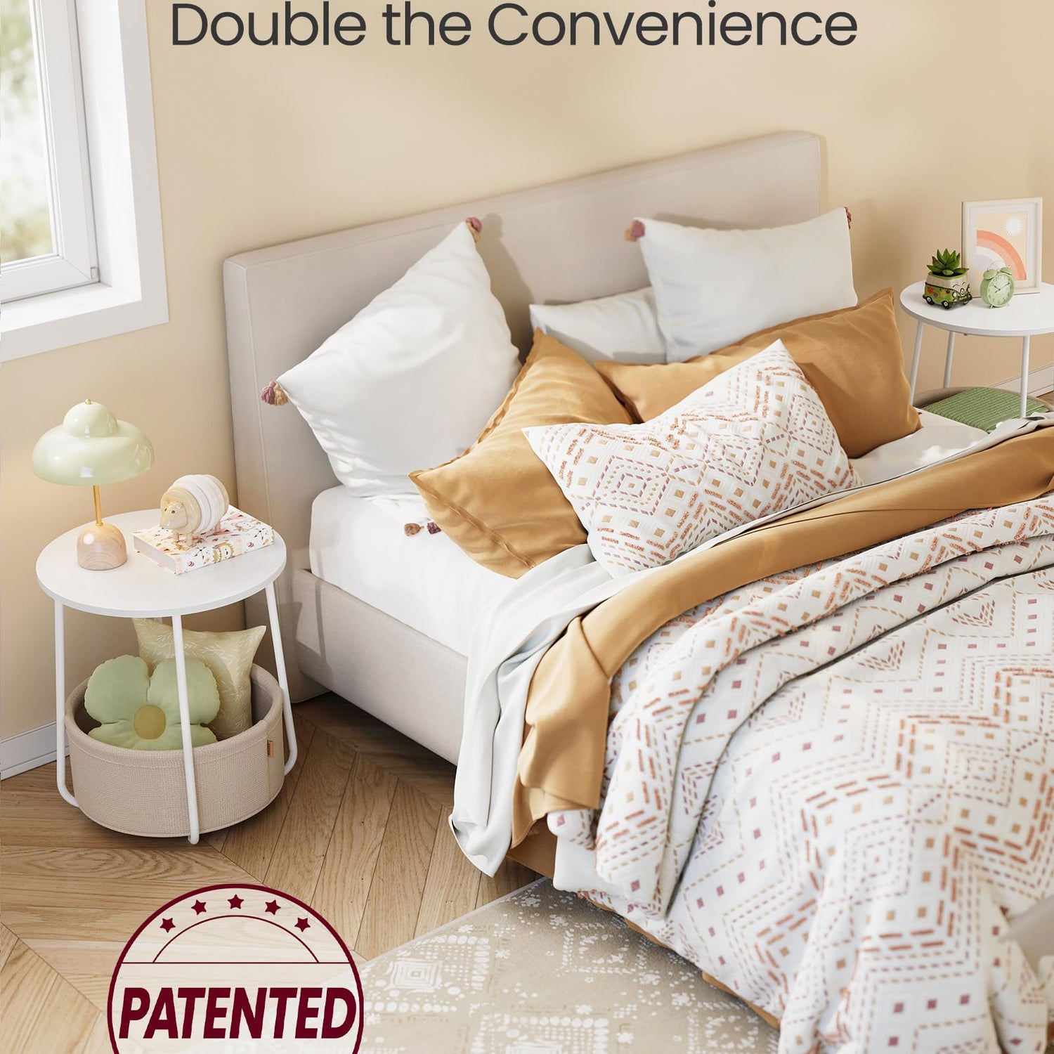 • 【MODERN AESTHETICS】Featuring a matte white round tabletop paired with a camel brown basket, each nightstand boasts a modern and minimalist look, adding elegance to any room. Patented Design, No. USD1065896S1