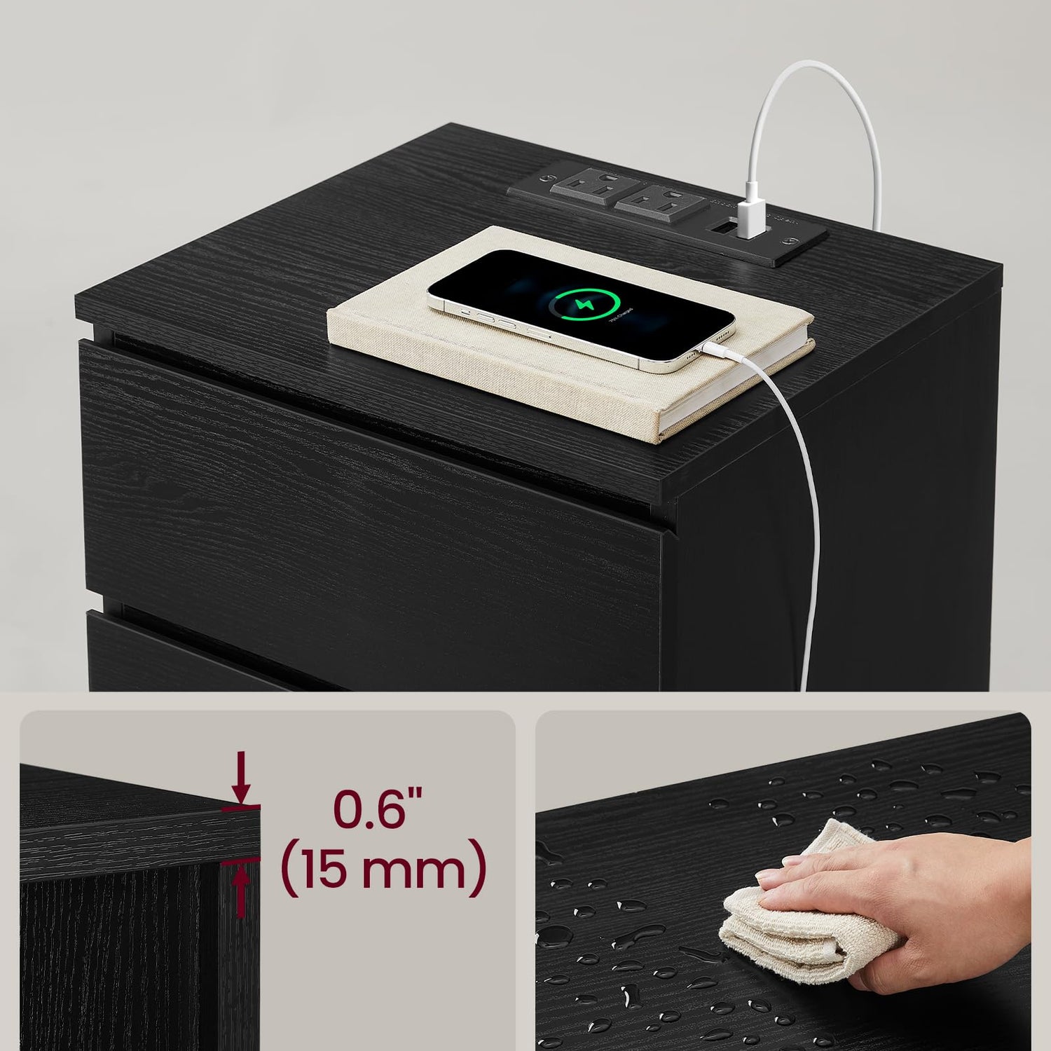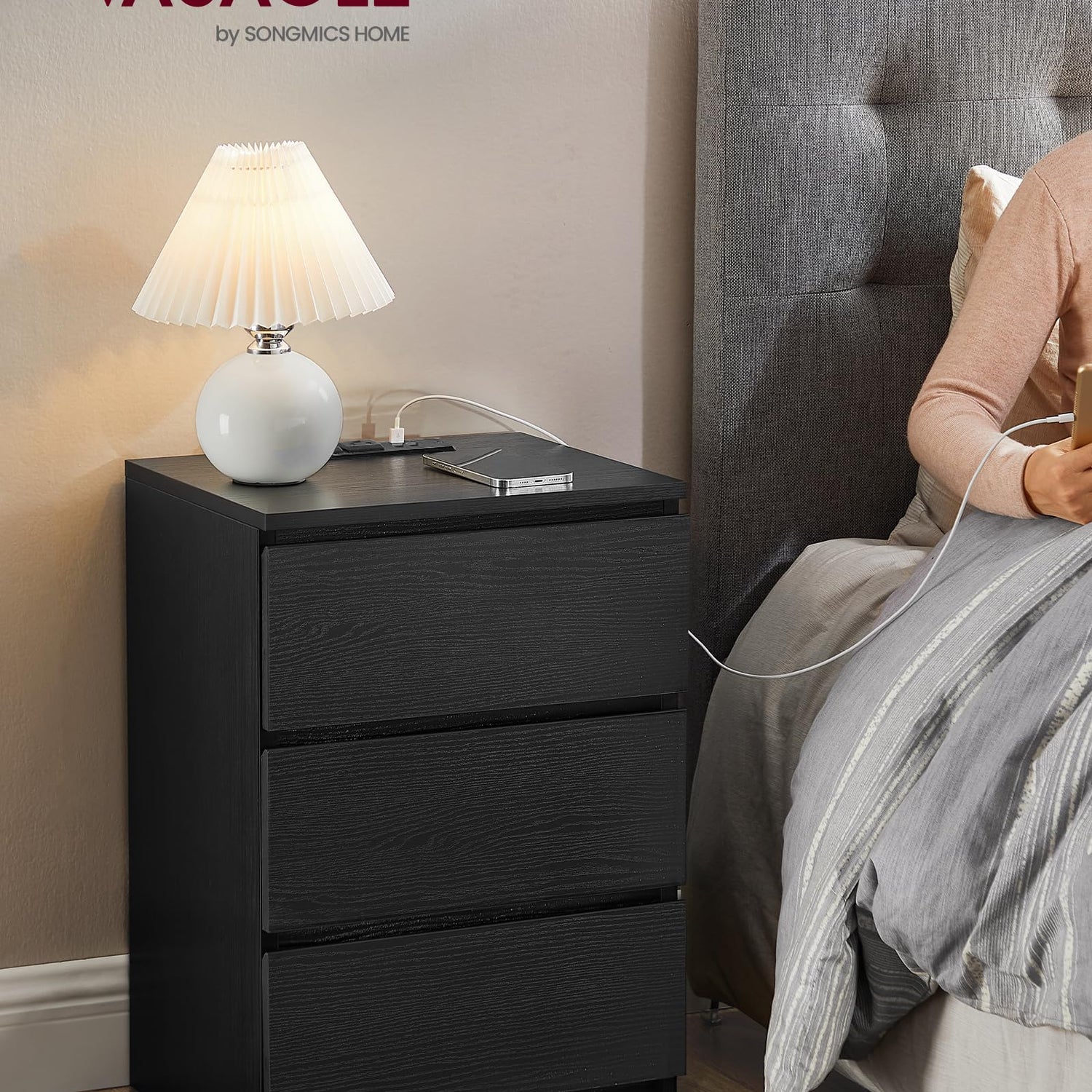 VASAGLE Nightstands with Charging Station, Set of 2, AC Outlets and USB Ports, Bedside Tables, Side Tables with 3 Drawers, Modern Style, 13.8 x 15.7 x 23.2 Inches, Ebony Black ULET731B58