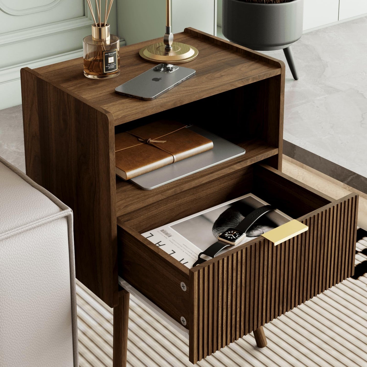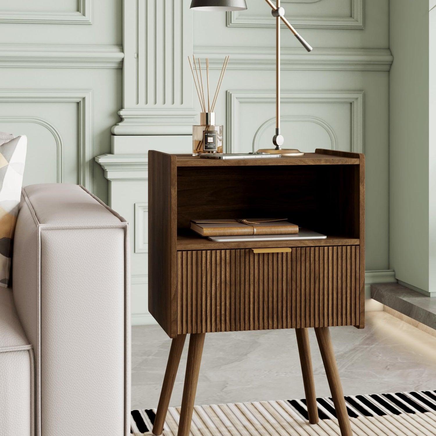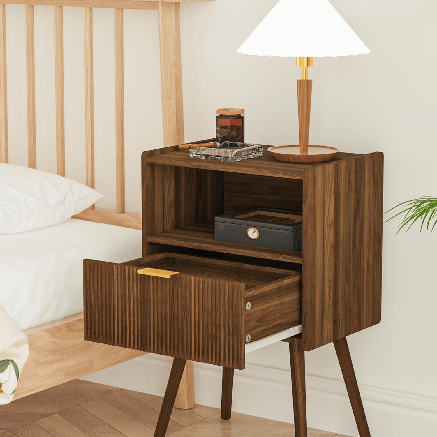 Veegle Nightstand,Modern Bedside Table with Storage Drawer and Open Wood Shelf, for Living Room, Bedroom and Small Spaces, Accent Night Stand with Solid Wood Legs, Easy Assembly,Walnut Brown