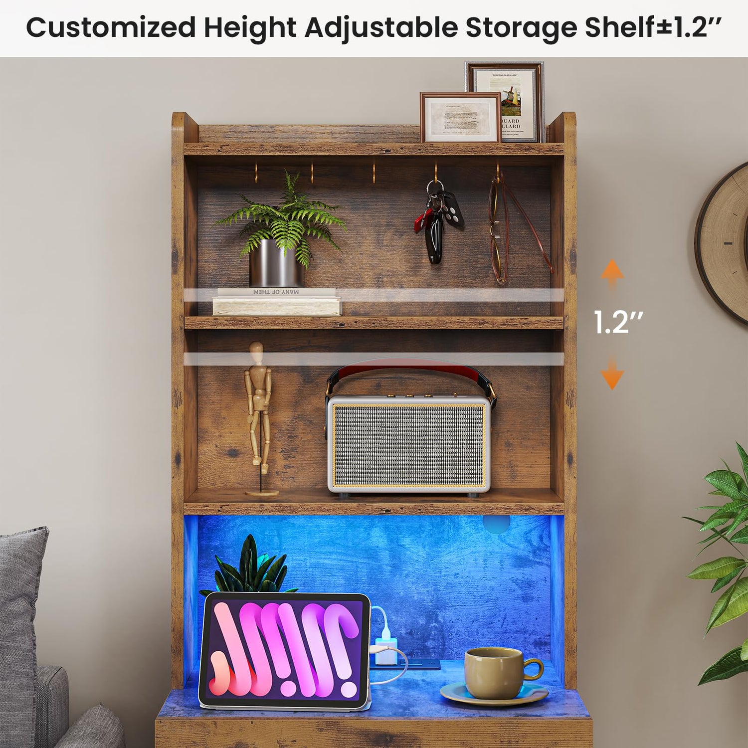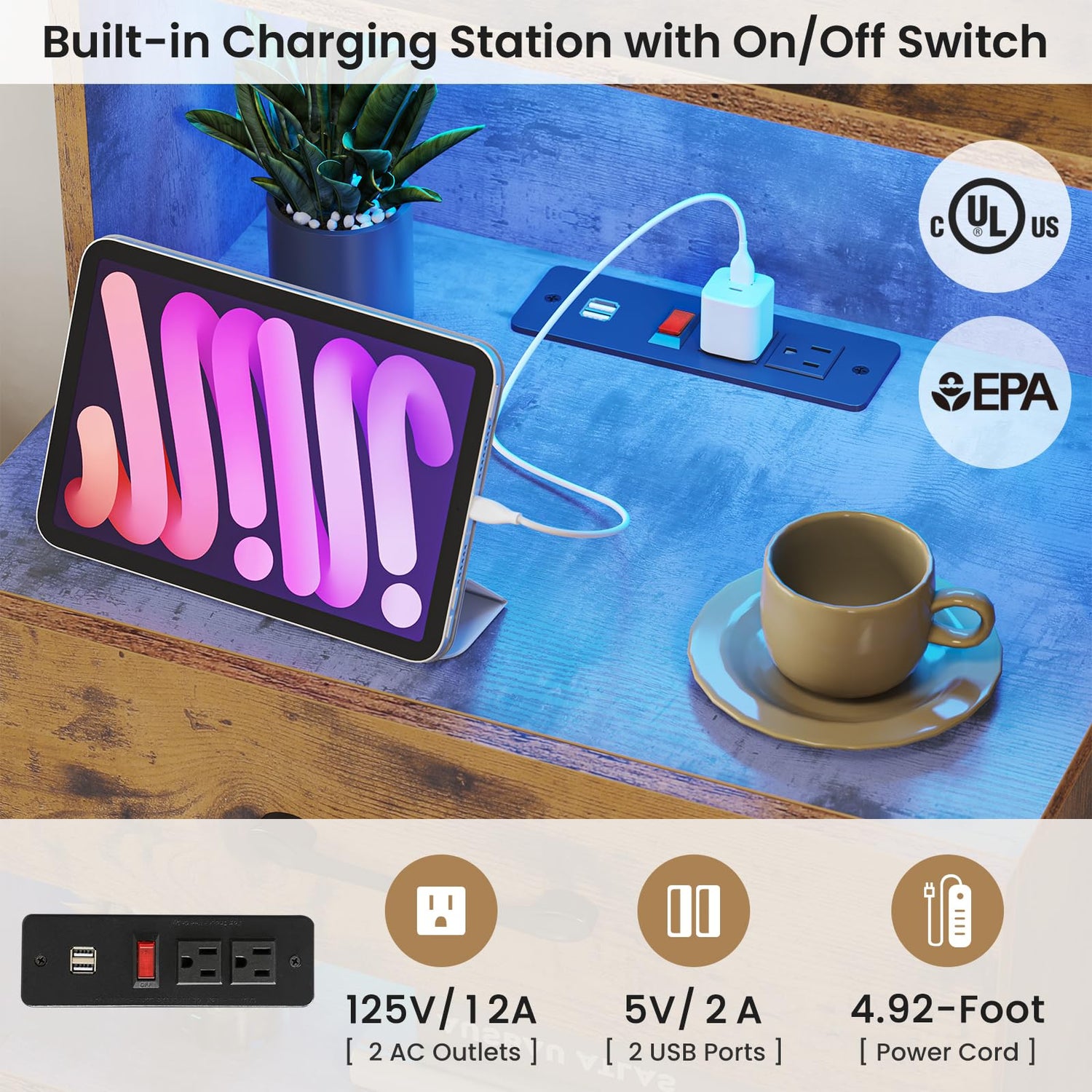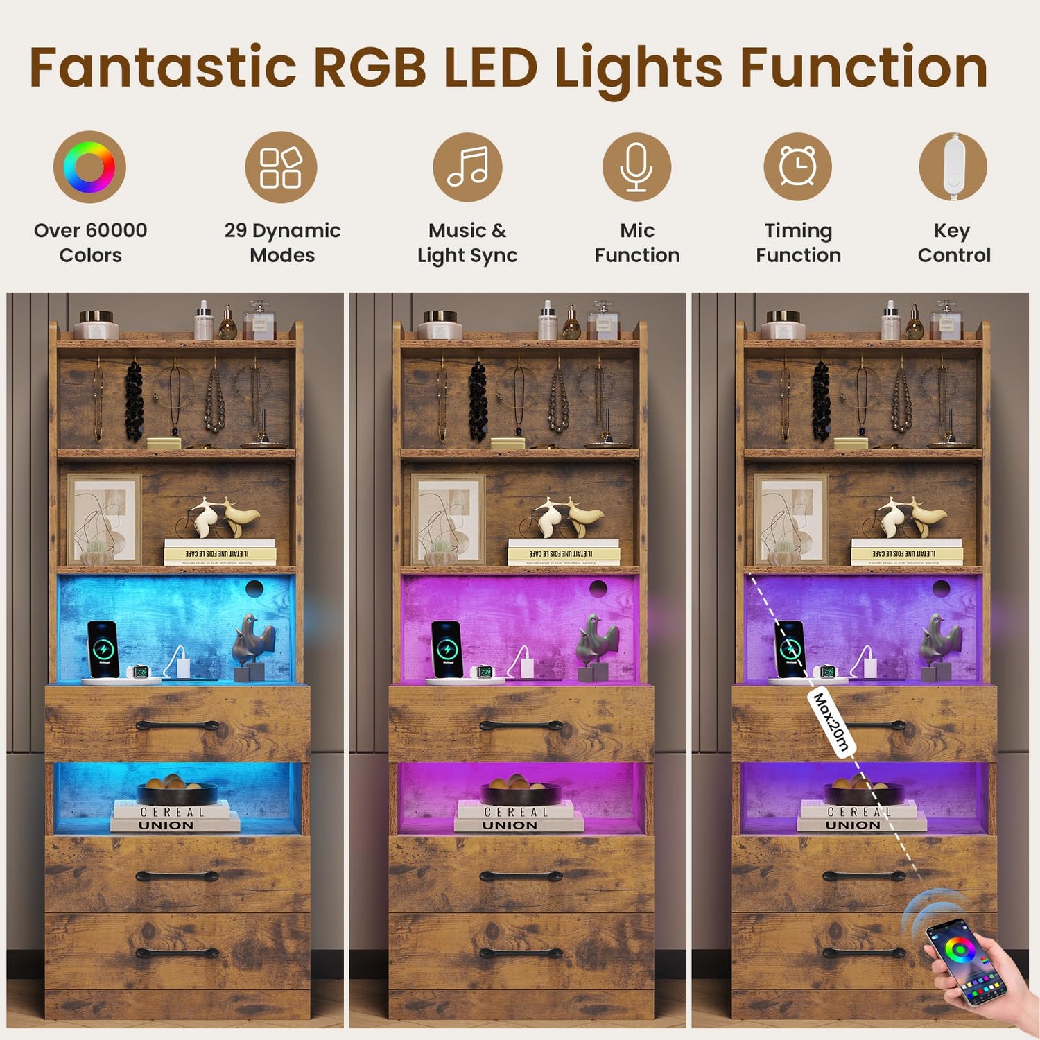 VIAGDO Tall Nightstand Set of 2 with Charging Station and LED Lights, Rustic Brown Night Stand Set 2 with Bookshelf, Modern LED Bedside Tables with 3 Drawers and Storage Shelves, Side Tables Bedroom