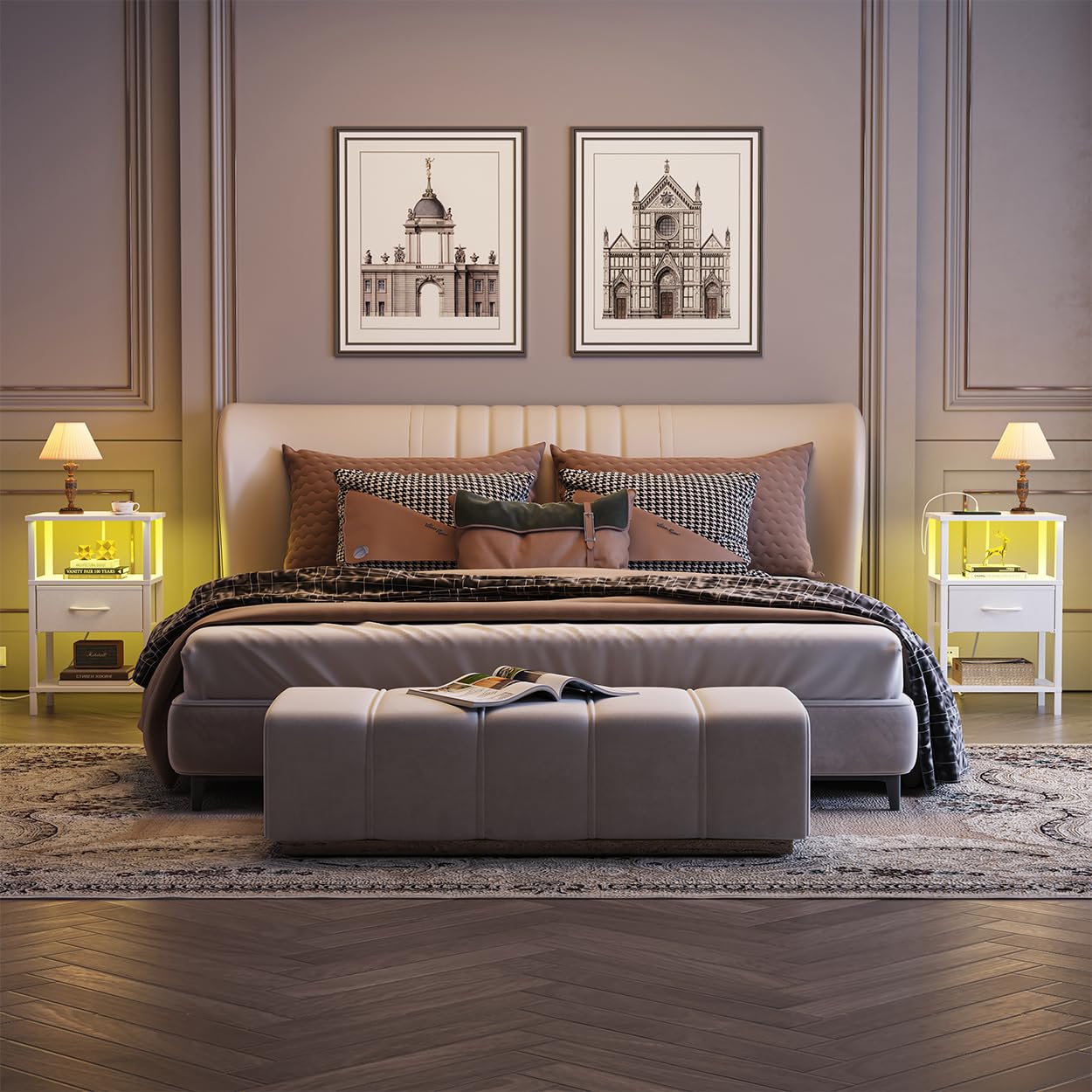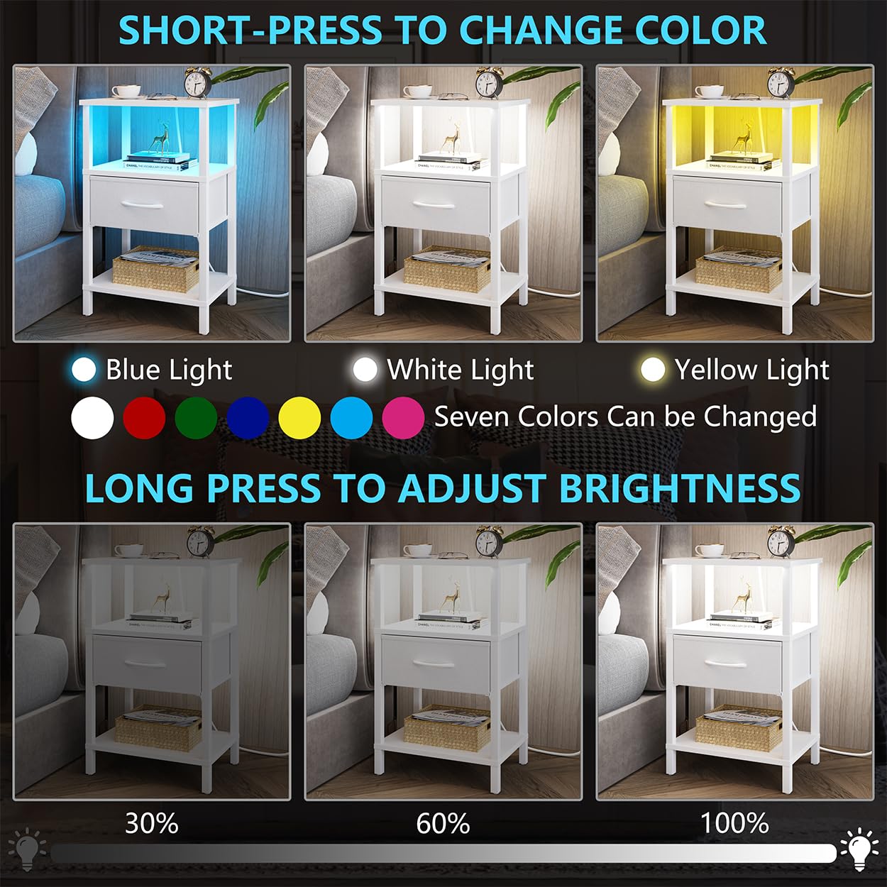 VIMBER Nightstand Set of 2, Adjustable LED Side Table with Charging Station and Fabric Drawer,Beside Tables with Open Compartment for Living Room, Easy Assemble, 3 Tier End Table for Bedroom, White