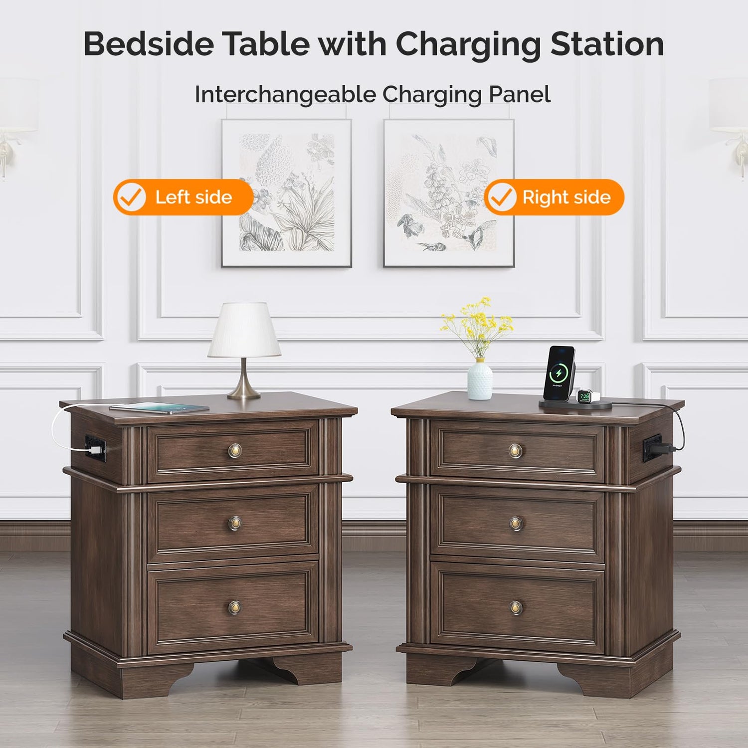 VINGLI Brown Nightstand Set of 2, Night Stand with Charger Station, Wood Nightstand with Textured Drawers, Large Nightstand, 3 Drawer Nightstand, Bedroom Nightstand, Bedside Table, Side Table