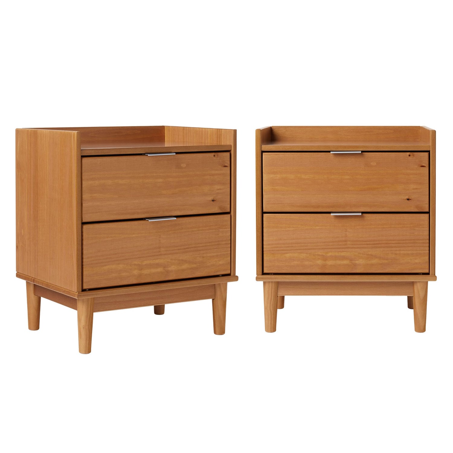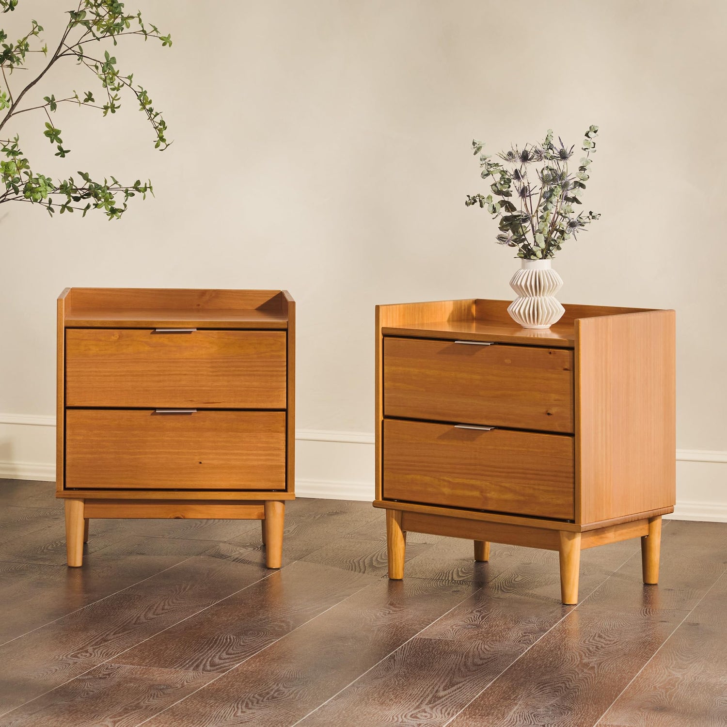 Walker Edison Mid-Century Modern 2-Drawer Solid Wood Nightstand, 20 Inch, Set of 2, Caramel