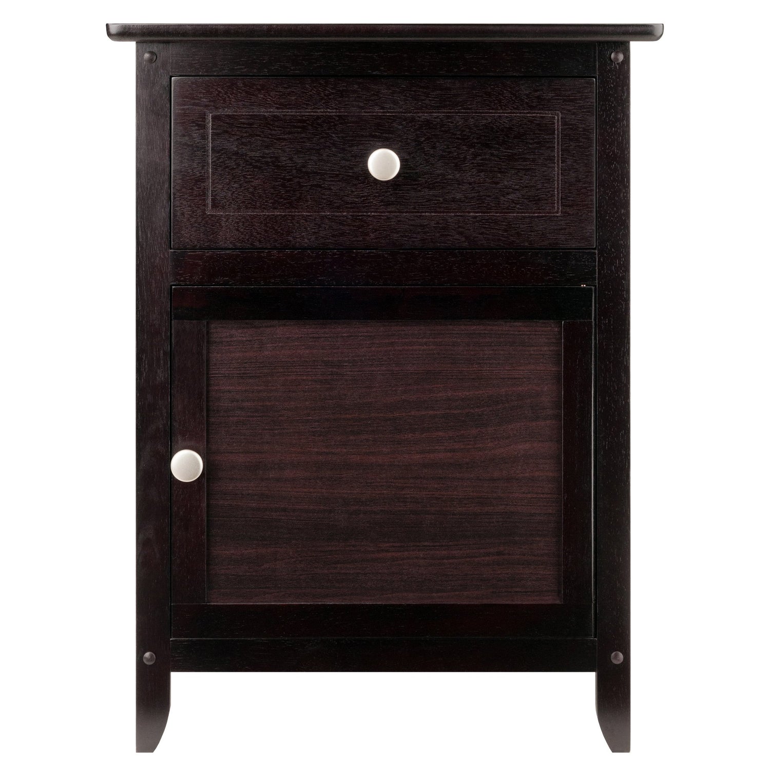 Details: Tuck remote controls and drink coasters inside the drawer of this attractive accent/end table from Winsome Wood. With its clean lines, slightly tapered legs, and uncomplicated design, the table fits easily into traditional and more modern interiors alike. Set the table next to a sofa in the living room, or use as a night stand with a lamp placed on top. The table is crafted out of wood/composite with a warm espresso finish. For storage, the table offers a small drawer and a single-shelf cabinet. Both the drawer and the cabinet door provide a round satin nickel knob for opening and closing; the cabinet’s hinges are pre-installed on the right side of the door to swing open from left to right only. Upon delivery, the table requires home assembly and comes with necessary hardware and tools. The assembled table measures 19 inches wide by 15 inches deep by 25 inches high. This item weighs 21 pounds upon shipping.Top Material: Medium-Density Fiberboard (MDF)