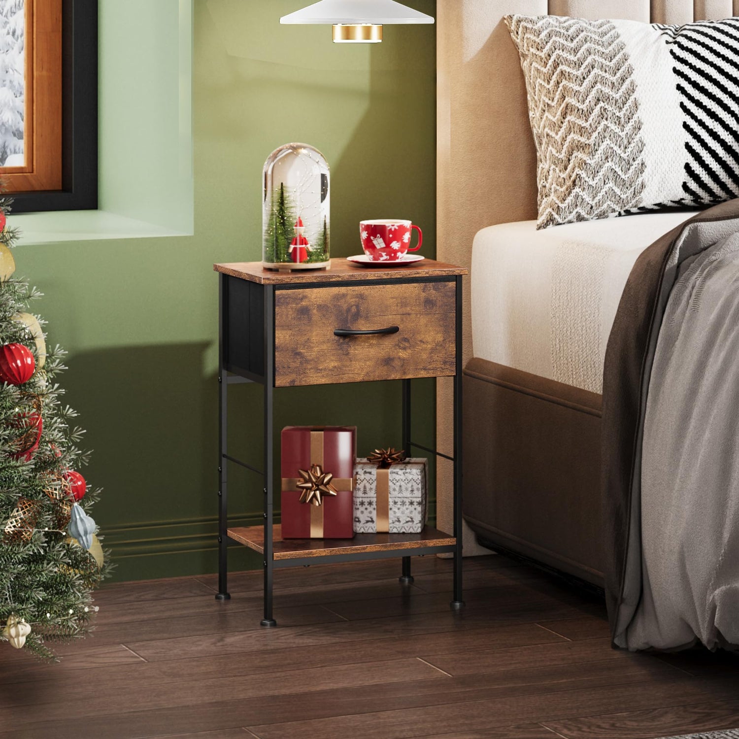 WLIVE Nightstand, Bedside Side Table for Bedroom, Dorm with Steel Frame, Night Stand End Table with Fabric Storage Drawer, Easy Assembly, Rustic Brown Wood Grain Print, 11.73''D 15.67''W 25.03" H