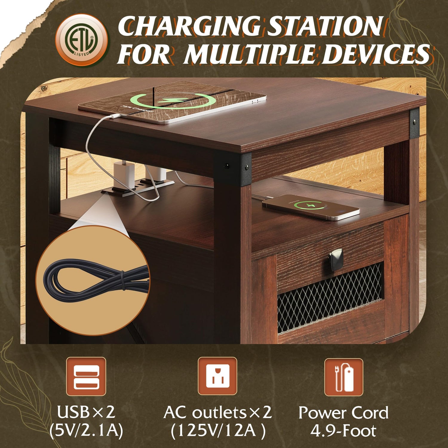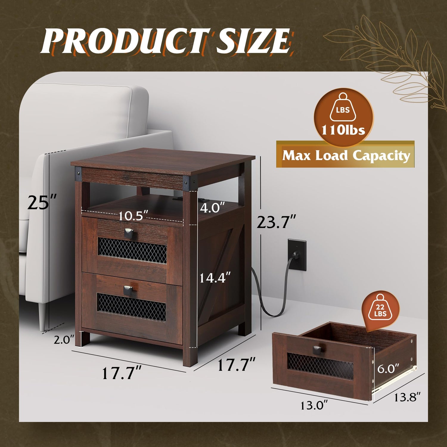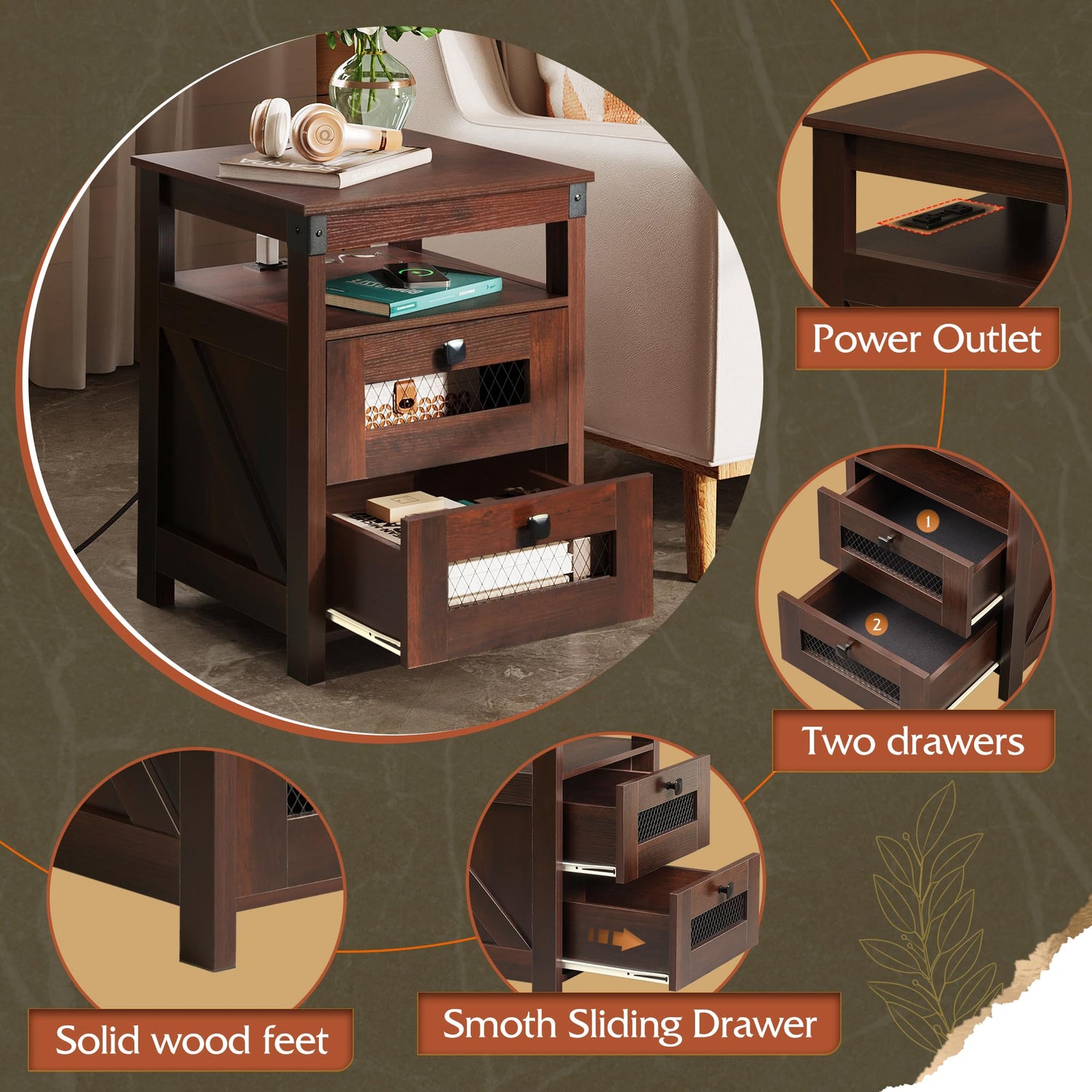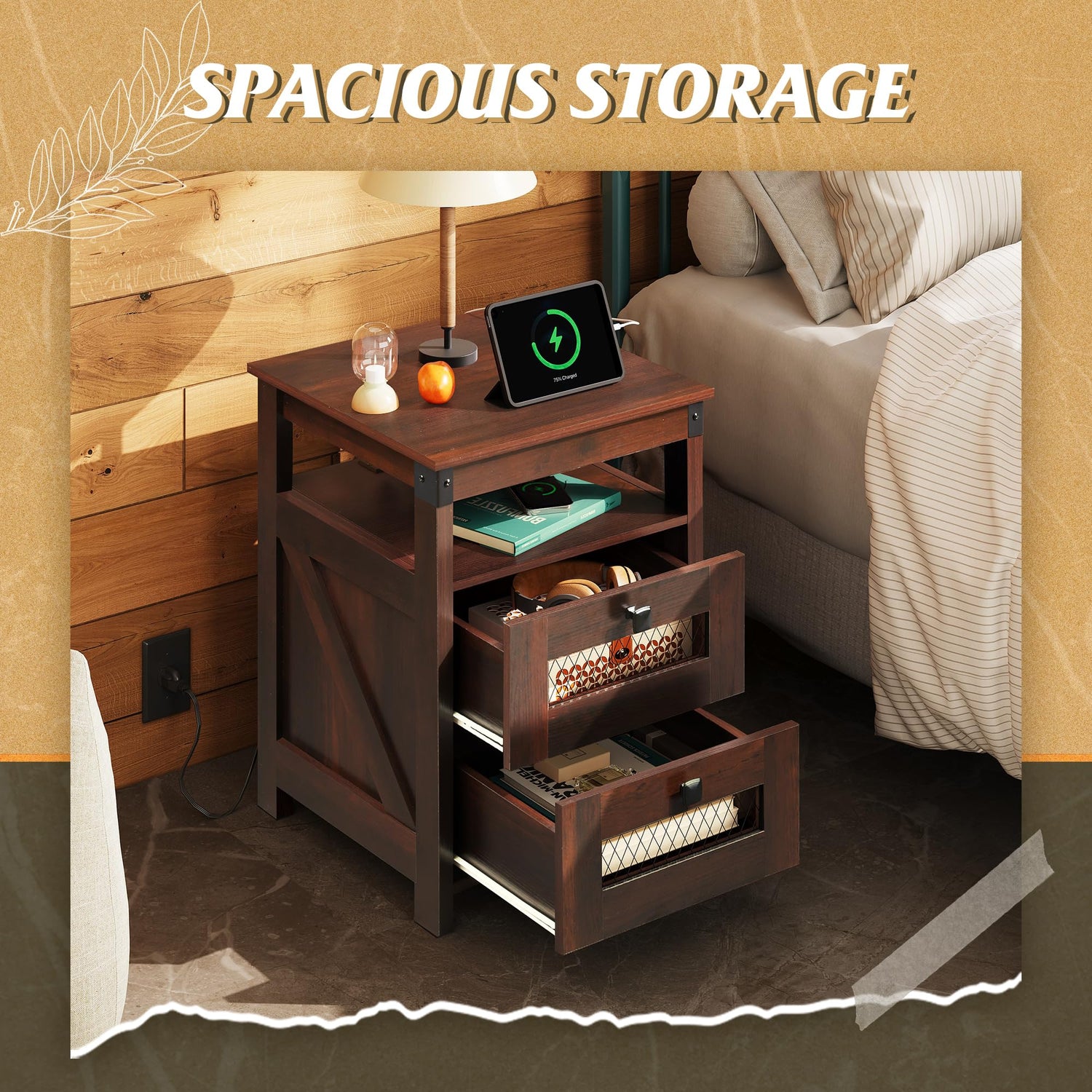 WLIVE Nightstand with Charging Station, Farmhouse End Table, Side Table with 2 Mesh Drawers Storage & Open Shelf, Rustic Wooden Cabinet Night Stand for Living Room, Bedroom, Espresso