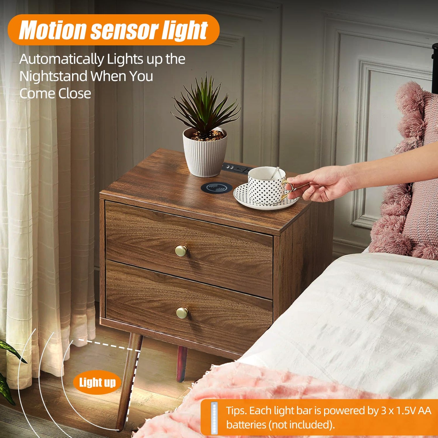 - ๐๐ข๐ซ๐๐ฅ๐๐ฌ๐ฌ ๐๐ก๐๐ซ๐ ๐๐ซ & ๐๐ฎ๐ญ๐ฅ๐๐ญ ๐จ๐ง ๐๐จ๐ฉ - Equipped with a built-in 10W wireless charger, compatible with iPhone, Samsung, Nokia, Motorola, and other smartphone brands. Additionally, the walnut finish bedside table features 2 AC outlets and 2 USB ports on the left side, along with a 4.5-foot power cord.