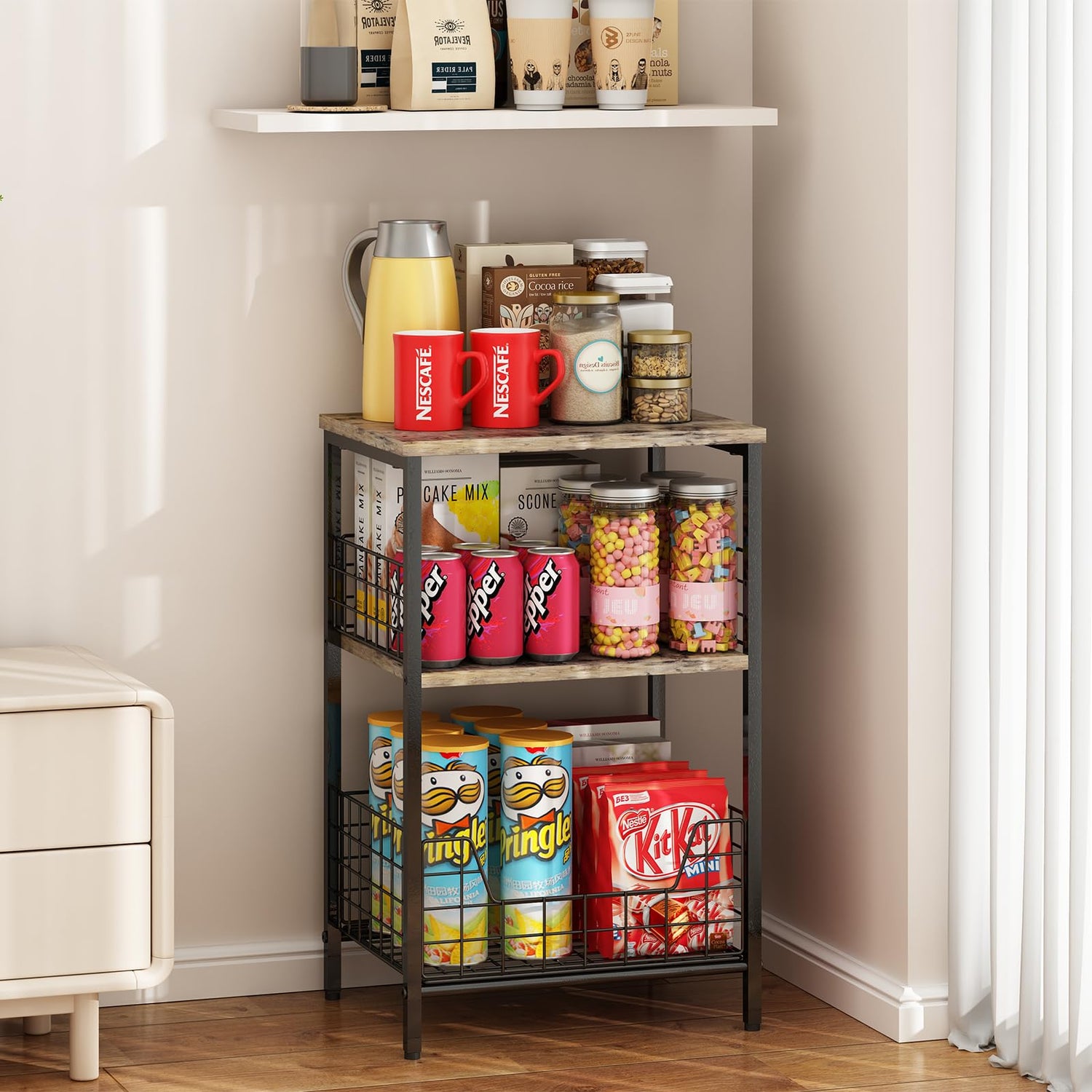 The practical 3-tier design provides abundant storage options to cater to your varying needs. The top and middle shelves offer ample space for displaying decor or storing essentials, while the spacious bottom U-shaped iron wire basket ensures easy access to snacks, cans, or other items you wish to keep close at hand.