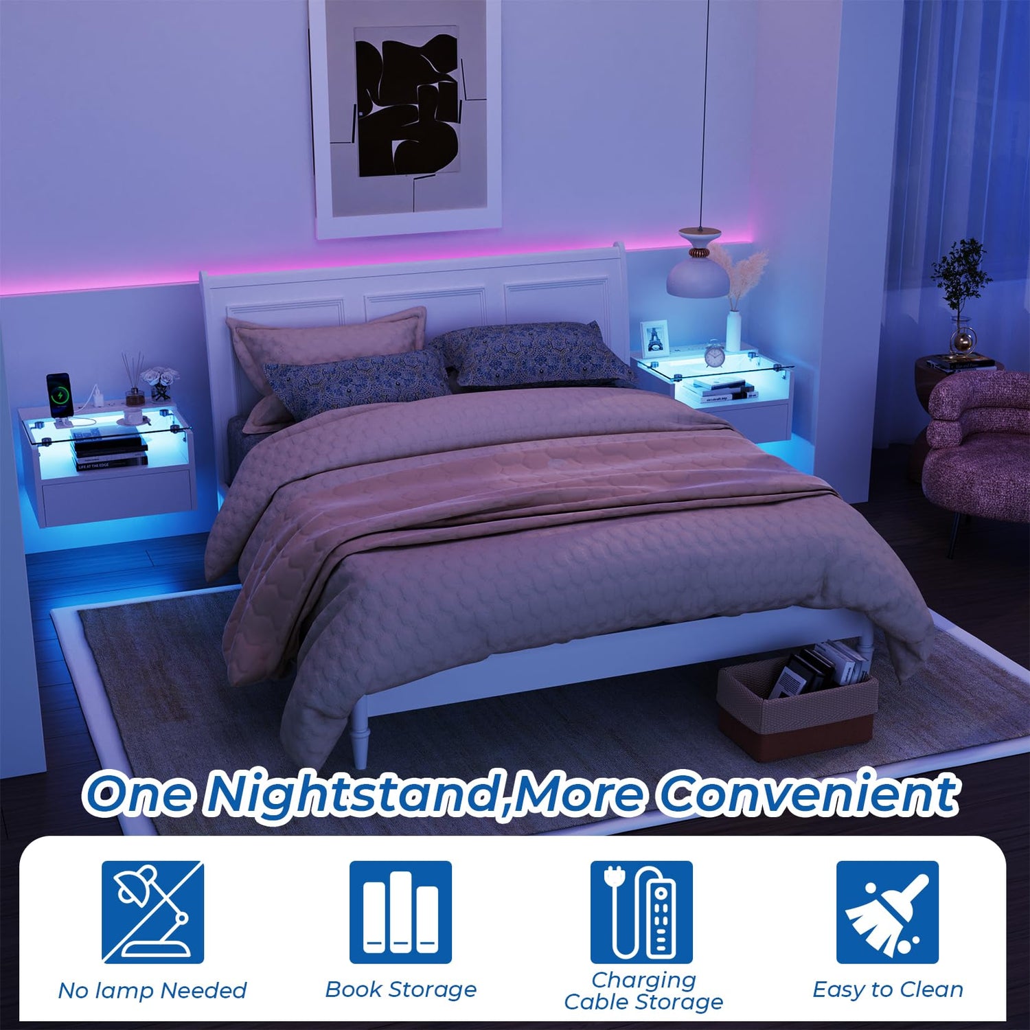 - 【 LED Ambient Lighting & Glass Tabletop】The floating nightstand with LED ligting, LED lights are refracted through the glass, making the light softer and more romantic. It makes the whole bedroom look very advanced.