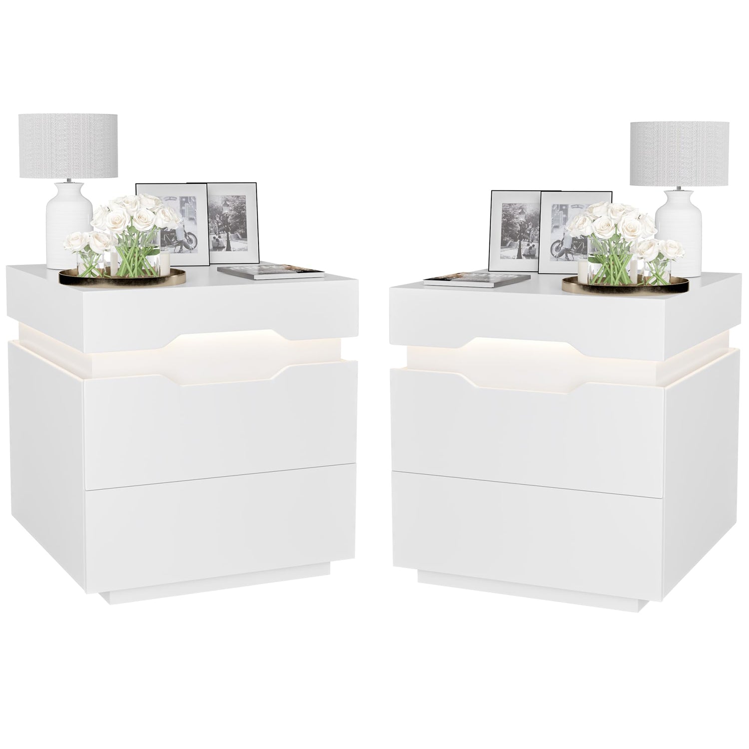 YESHOMY Nightstand with LED Light and Charging Station, Endtable with 2 Drawers, Bedside Table with Large Capacity, for Bedroom, Set of 2, 21.2" Height, White