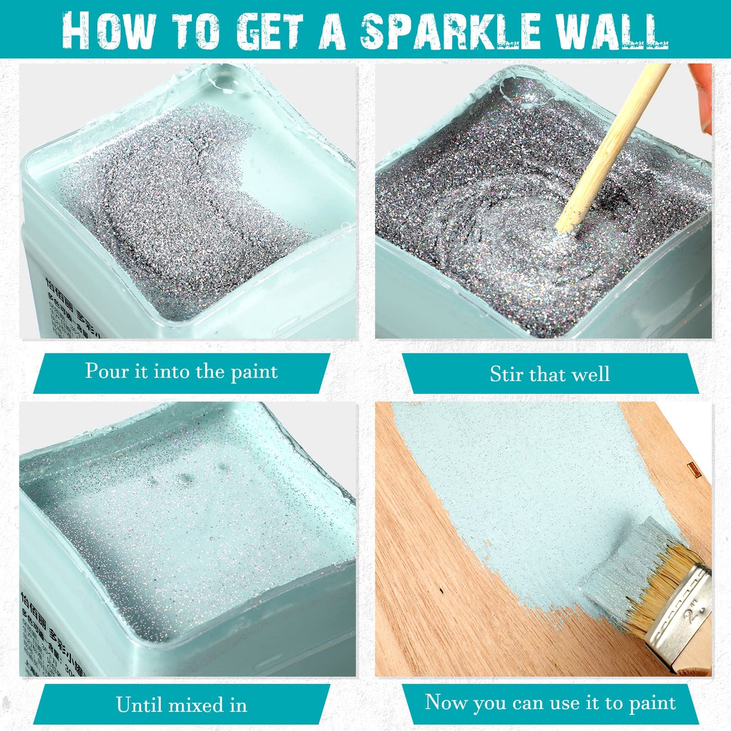 • Instructions for Use: when mixing paint, it is recommended to pour glitter paint additive into a paint bucket and mix thoroughly until there is no obvious particle agglomeration before painting, the intensity of the glitter effect depends on the glitter you mix and paint ratio; Since the product is in fine granular form, please be careful not to let children touch it to avoid accidentally eat