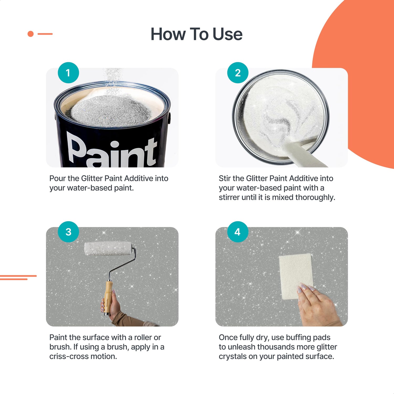 - QUICK & EASY TO USE - Your plain walls will be sparkling in no time! Simply add 3.5oz (100g) of Glitter Paint Additive per 1qt (1l) of latex paint. Stir for a few minutes until all the glitter is mixed thoroughly, then begin painting with a roller or brush, making sure your surface is clean and dry before applying. Once your glitter paint has fully dried you can begin buffing to greatly increase the glitter coverage.