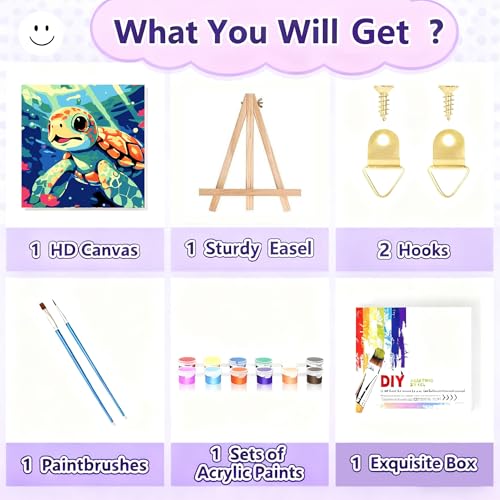 - Gemozaic Cute Sea Turtle Kids Paint by Number Kit Included: Framed HD Canvas with printed numbers, wooden easel, acrylic paints, nylon brushes, wall-mounted hooks & screws