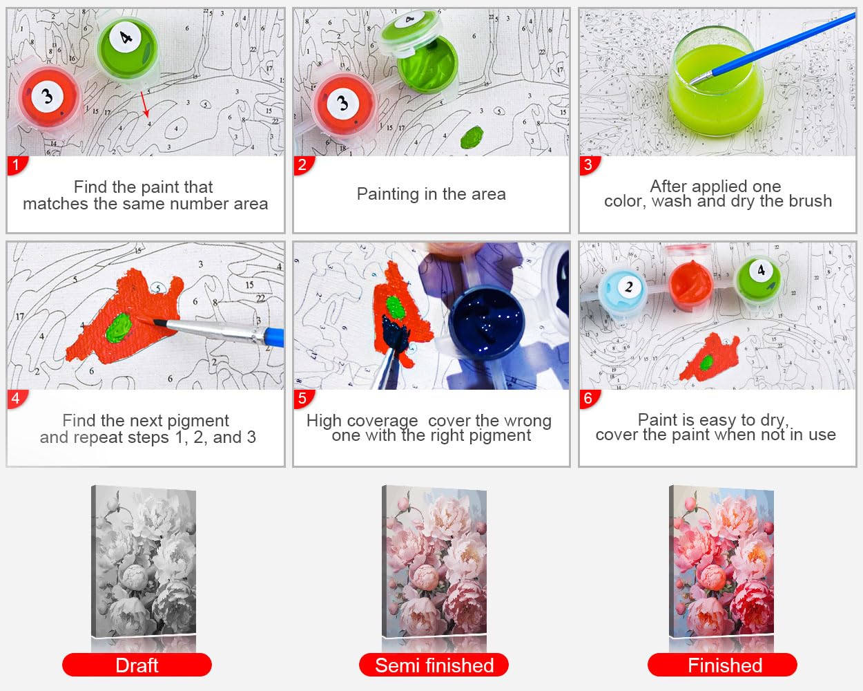 - 【Easy to Paint】Paint by numbers suitable for all skills levels adults. You only match the numbers of the paint and the figures on canvas to fill in the paint. Finish the painting one by one.