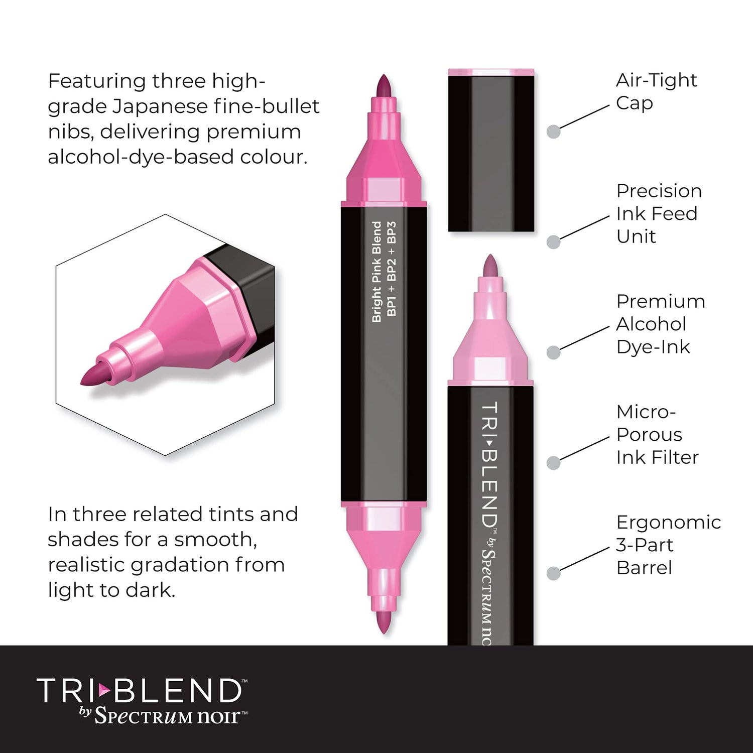 Details: Spectrum Noir TriBlend Markers are a true breakthrough innovation for colorists with a unique 3-in-1 design. Each marker includes 3 shades that will help you achieve a perfect blend each time. These TriBlend Markers offer expansive and smooth coverage as well as great detail with the fine bullet nib.