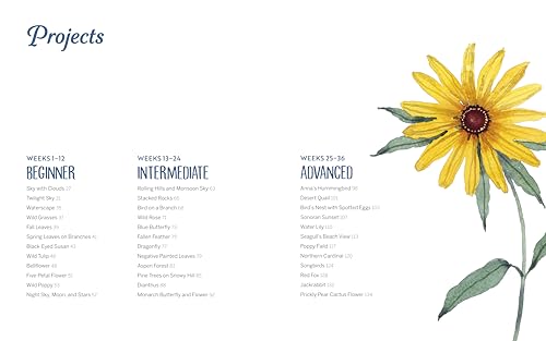 Step-by-step illustrations: Follow along with beginner-friendly instructions and tried-and-true techniques—with watercolor visuals at every step 36 nature-inspired projects you can frame, including wild poppies, Sonoran sunsets, songbirds, and water lilies Chapters organized by skill level—beginner, intermediate, and advanced—that will help grow key skills every week, including color mixing and water control, to take your watercolor practice to the next level