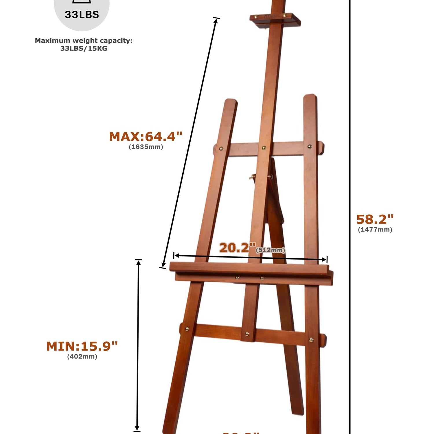 - BASIC PROPERTIES:This easel is made of pine wood, natural and environmentally friendly, sturdy and durable, with clear wood grain. The easel measures 20.3‘ x 24.0’ x 58.3" and is recommended to hold a maximum weight of up to 33 lbs