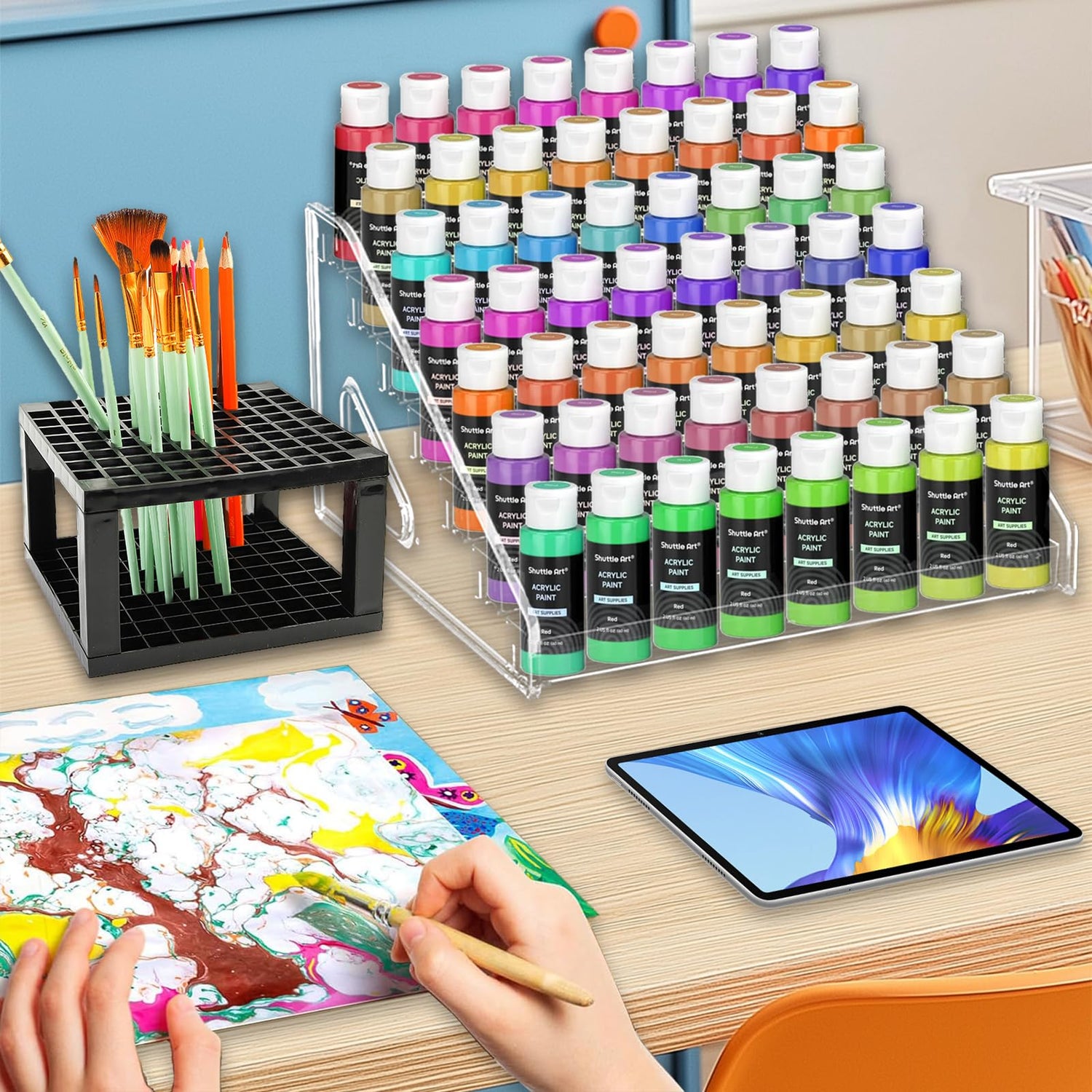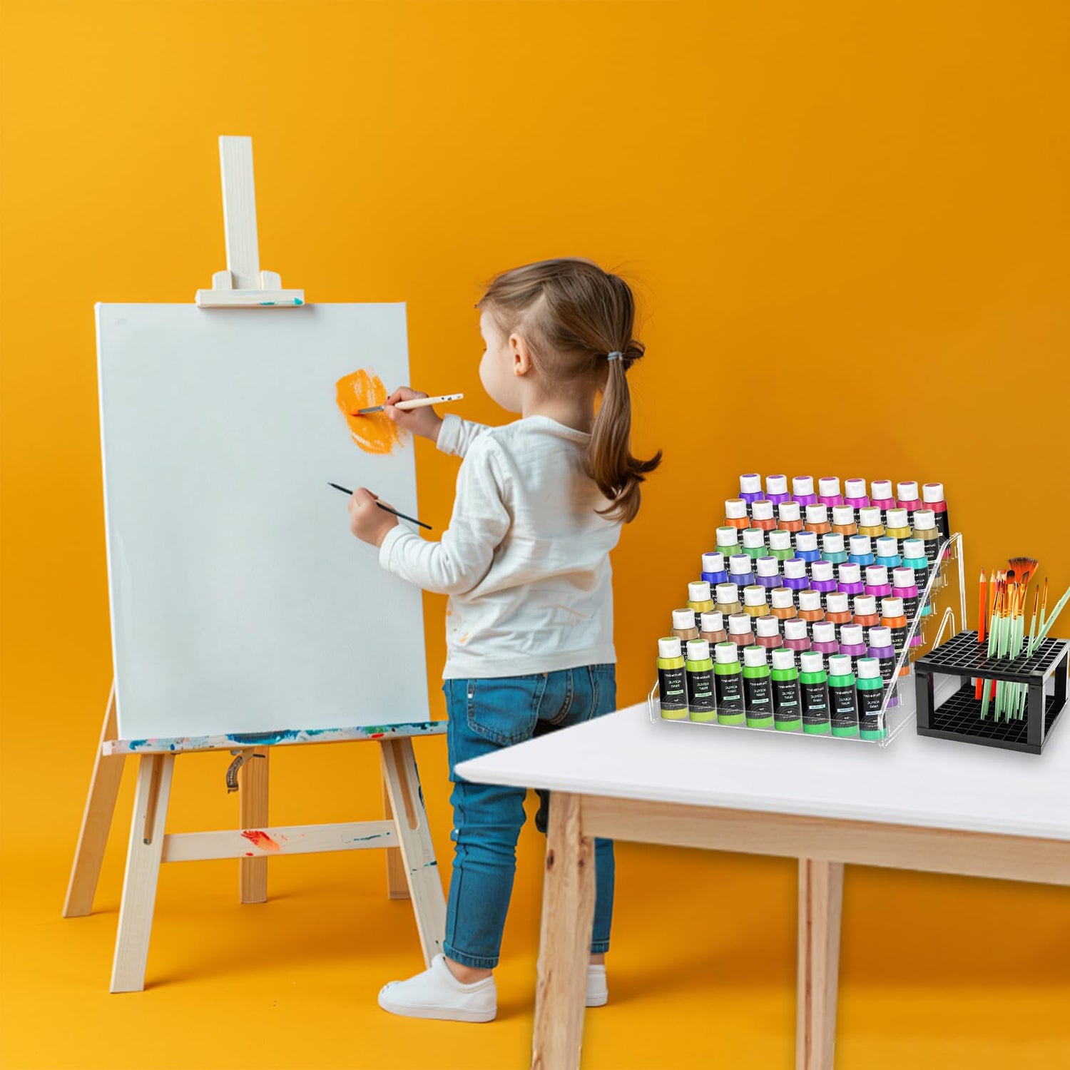 The lightweight yet sturdy acrylic frame fits snugly on desks, shelves, or rolling carts. Pair multiple units vertically or horizontally to maximize wall or tabletop space. Whether you’re a professional painter, weekend crafter, or parent managing kids’ art supplies, this organizer adapts to your needs.
