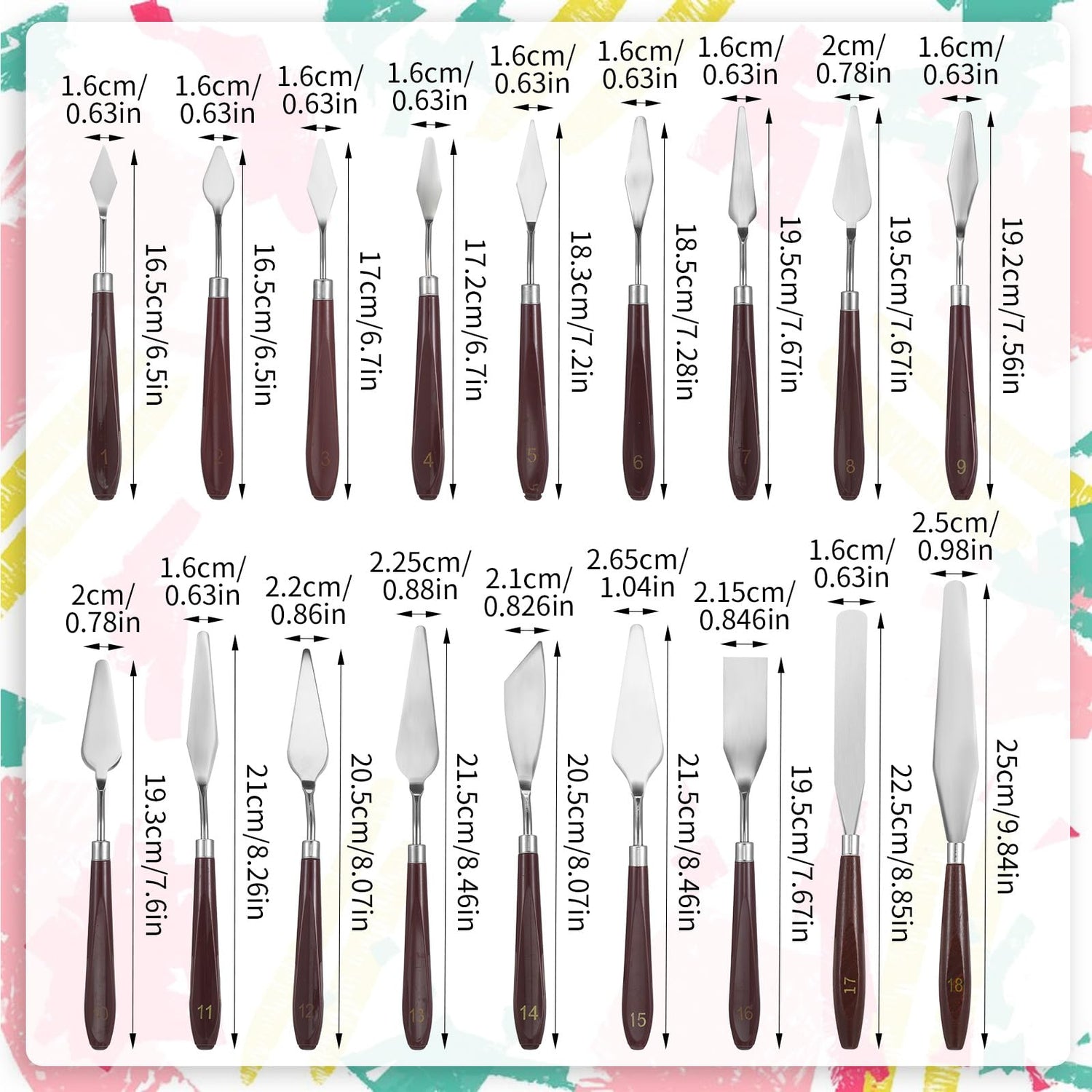 - 27-Piece Palette Knife Set: This versatile palette knife set includes 27 different knives, each with unique shapes and sizes, perfect for a variety of artistic techniques. Whether you're creating textured backgrounds or painting intricate details, this set has the right tool for every task.The enough quantity also supports your daily use and sharing requirement, and you can choose or change them that suit your painting preference.