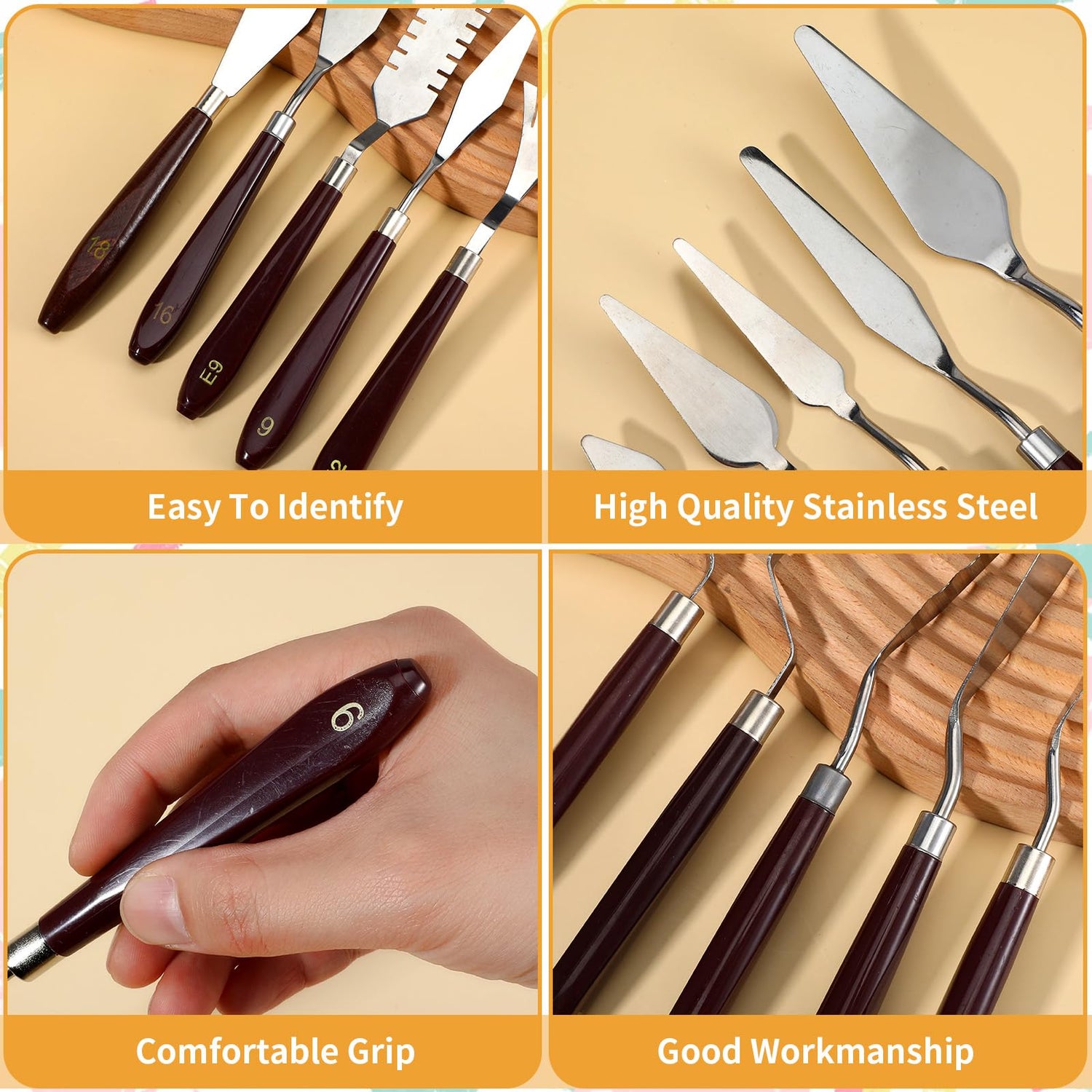 - High-Quality and Durable Materials: Made from premium 401 stainless steel and wood, these palette knives are built to last. The stainless steel blades are resistant to breaking, tearing, and rusting, while the wooden handles' curved shape can well fit your handprovide a comfortable grip and excellent control, making them ideal for extended use.