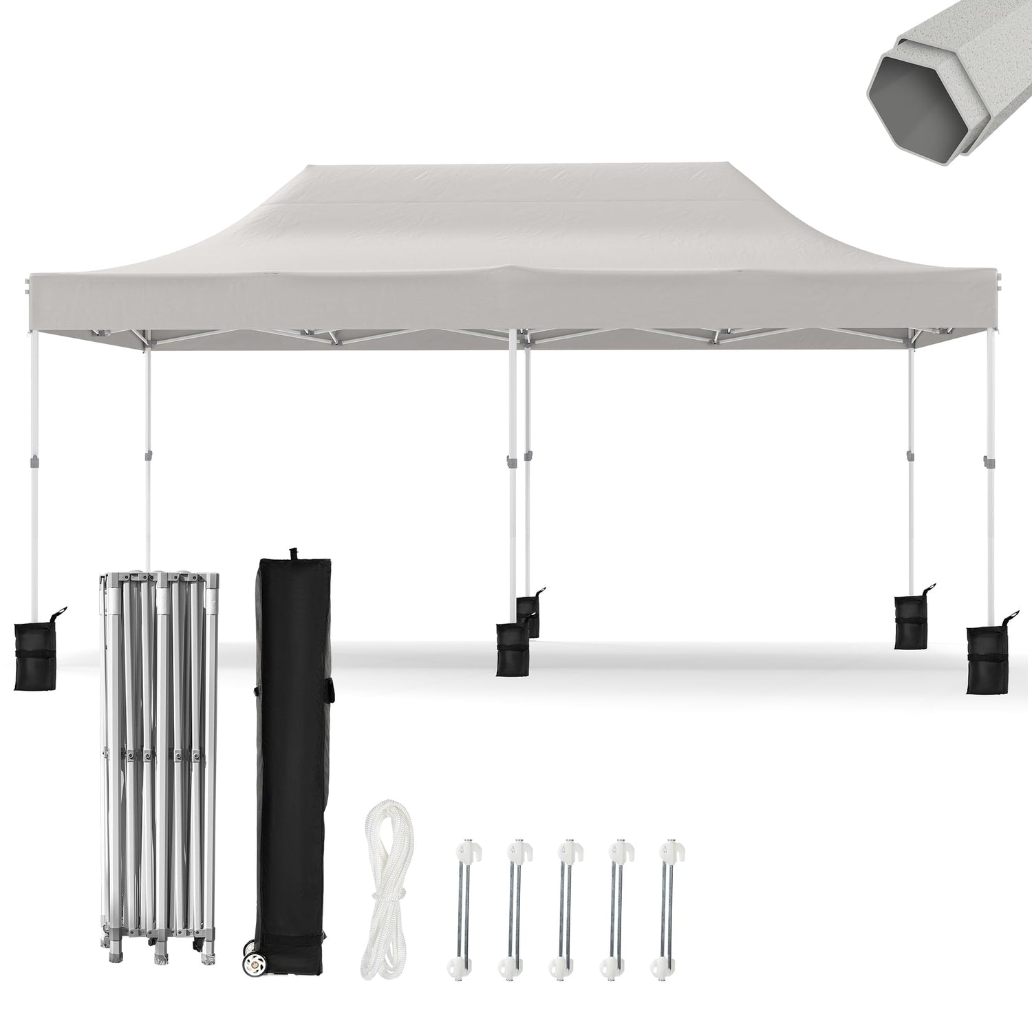 - What Will You Receive: One 10x20 ft frame + One canopy top cover + Six weight bags + Ten stakes + Six ropes + Five spare screws