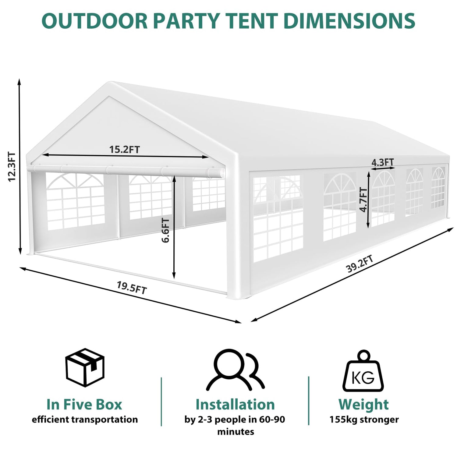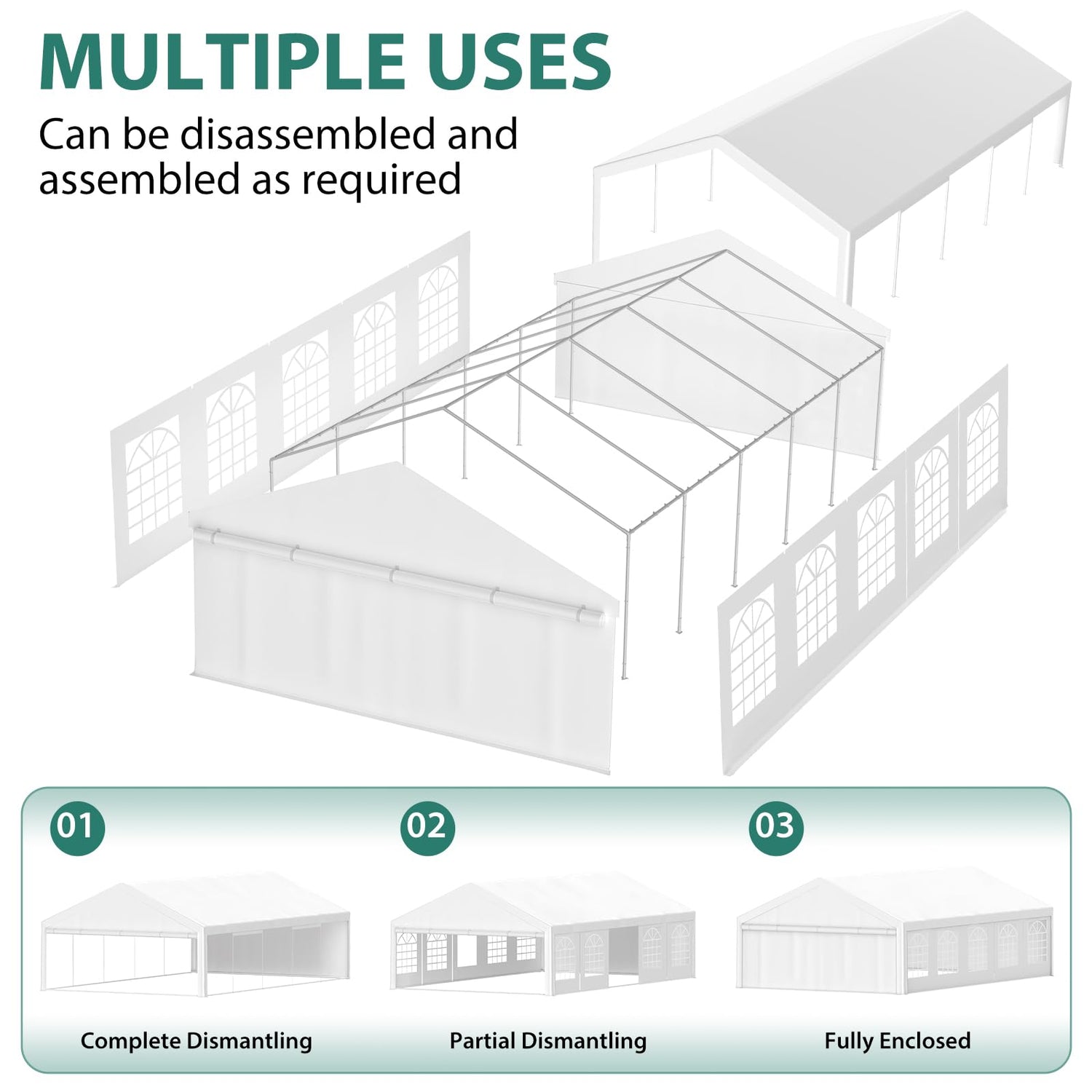 - Versatile Application: Featuring removable sidewalls, our heavy duty tent is versatile for parties, weddings, commercial events, and any other occasion you can envision. Our large tent can also serve as a warehouse or carport, enabling versatile use.