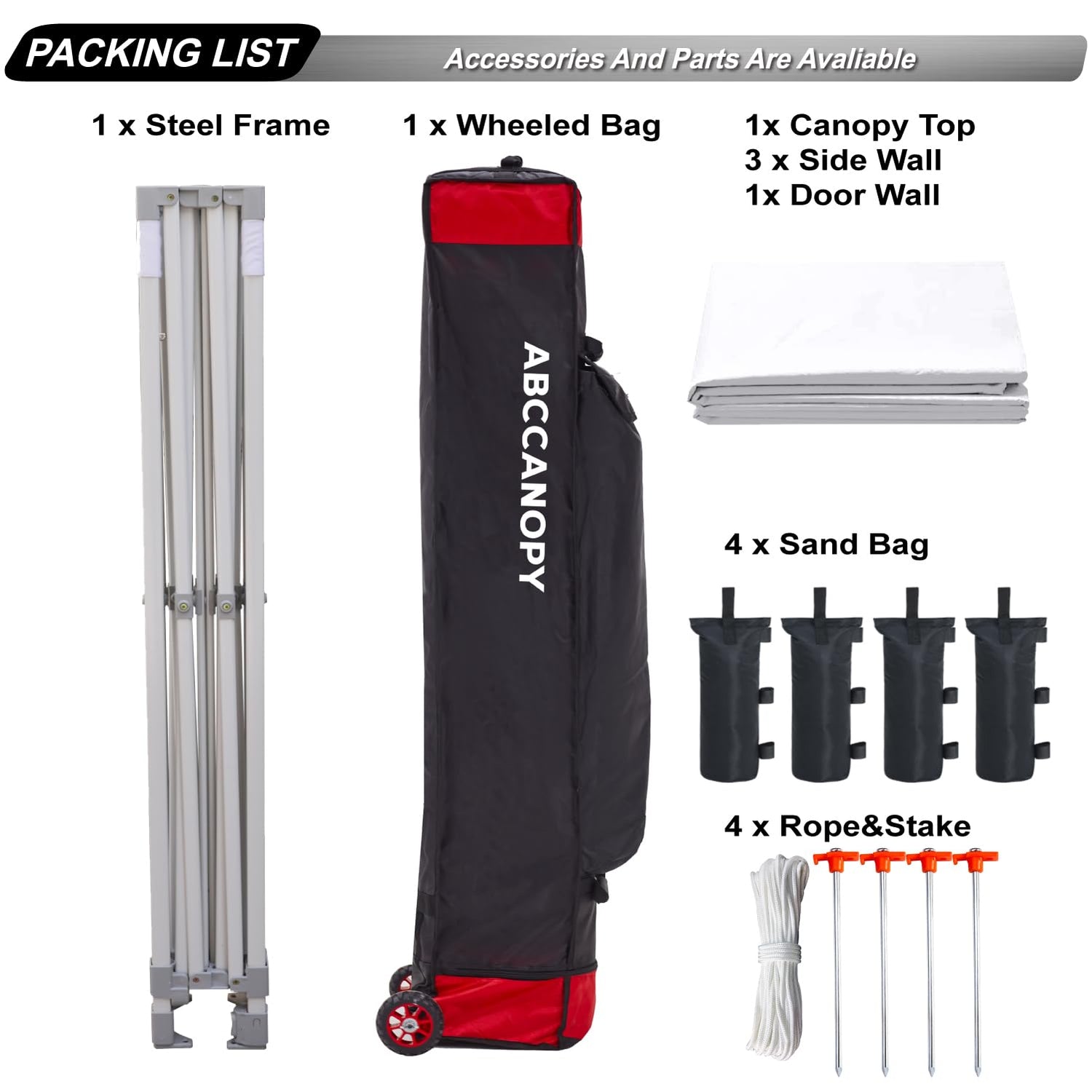 - WHAT IS INCLUDED - Commercial 10'x10' Pop Up Canopy Frame, 10'x10' Canopy Top Cover, 3 Removable Side Walls, 1 Door Wall. Roller Bag,4 Weight Bags, 4 stake and ropes.The upgraded style roller bag is more rugged and durable. One year after-sale protection for frame, six months after-sale protection for fabrics and accessories.