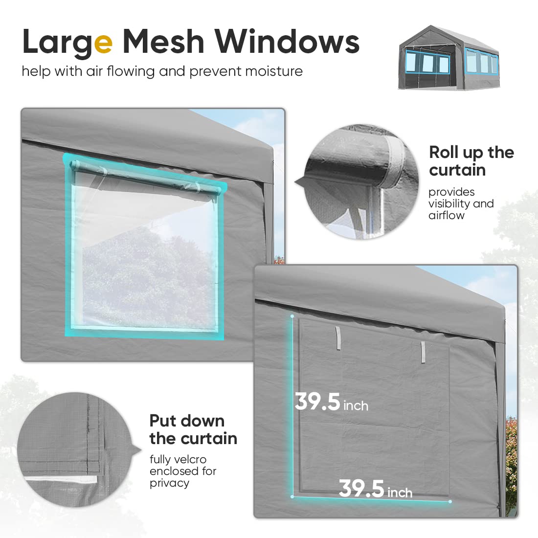 - 【Ventilation Windows with Roll-up Window Cover】- The garage tent is designed with 6 large mesh windows in the sidewalls, helping with airflow and preventing moisture. Each window equips a window cover outside to roll down for privacy or windproof.